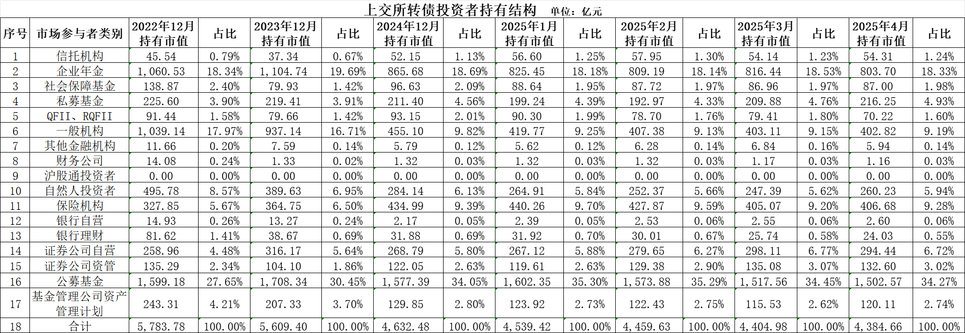 2025年4月,上交所转债投资者持有市值(债券面值)4,384.66亿元,其中公募基金持有市值占比34.27%,企业年金持有市值占比18.33%,自然人投资者持有市值占比5.94%,私募基金持有市值占比4.93%。
