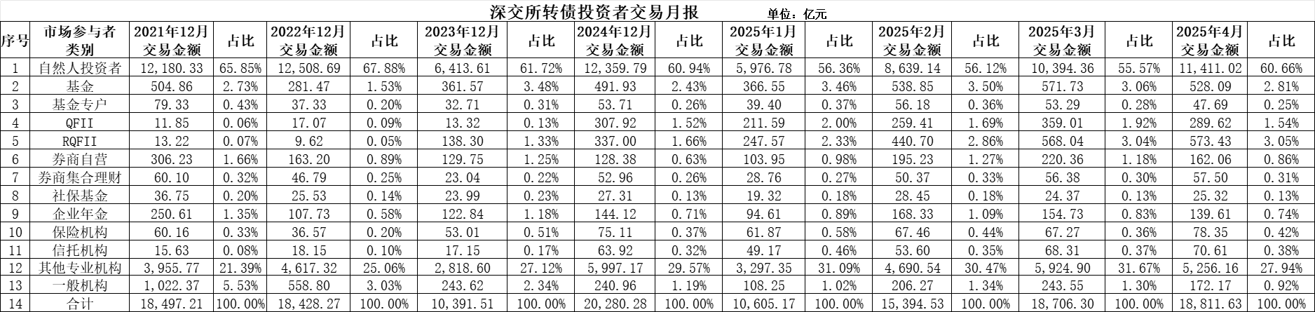 2025年4月,深交所转债投资者交易金额18,811.63亿元,其中基金(公募)交易金额占比2.81%,自然人投资者交易金额占比60.66%,企业年金交易金额占比0.74%,其他专业机构(私募)交易金额占比27.94%。