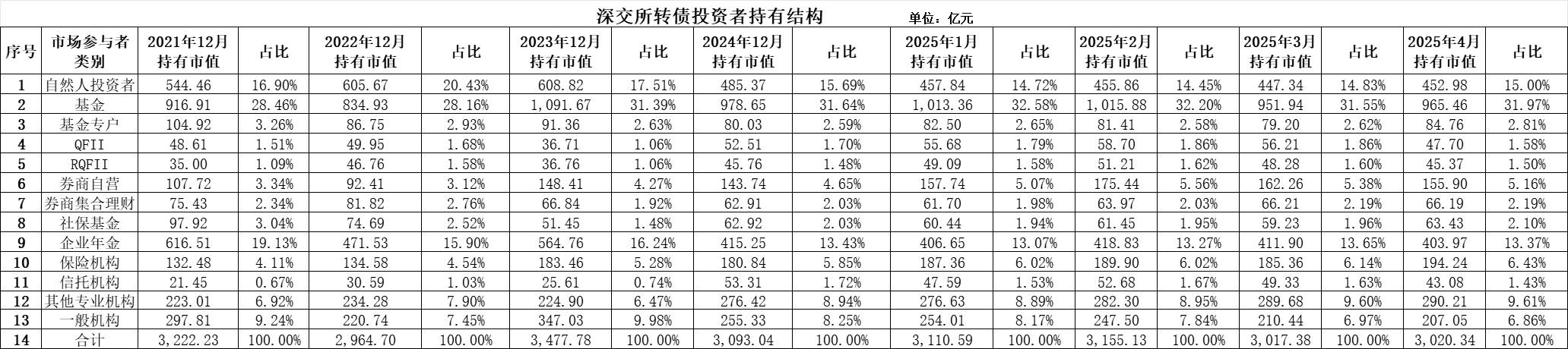 2025年4月,深交所转债投资者持有市值(债券市值)3,020.34亿元,其中基金(公募)持有市值占比31.97%,自然人投资者持有市值占比15.00%,企业年金持有市值占比13.37%,其他专业机构(私募)持有市值占比9.61%。