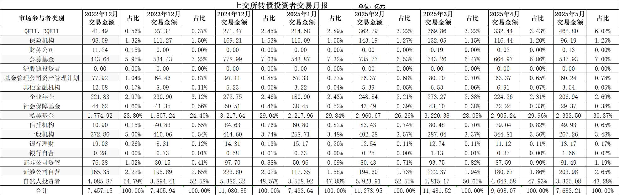 2025年5月,上交所转债投资者交易金额7,683.21亿元,其中公募基金交易金额占比7.00%,自然人投资者交易金额占比43.28%,企业年金交易金额占比2.69%,私募基金交易金额占比30.37%。