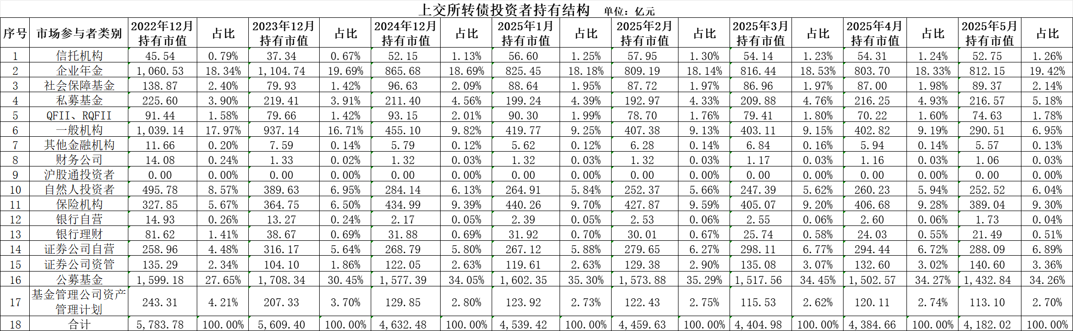 2025年5月,上交所转债投资者持有市值(债券面值)4,182.02亿元,其中公募基金持有市值占比34.26%,企业年金持有市值占比19.42%,自然人投资者持有市值占比6.04%,私募基金持有市值占比5.18%。