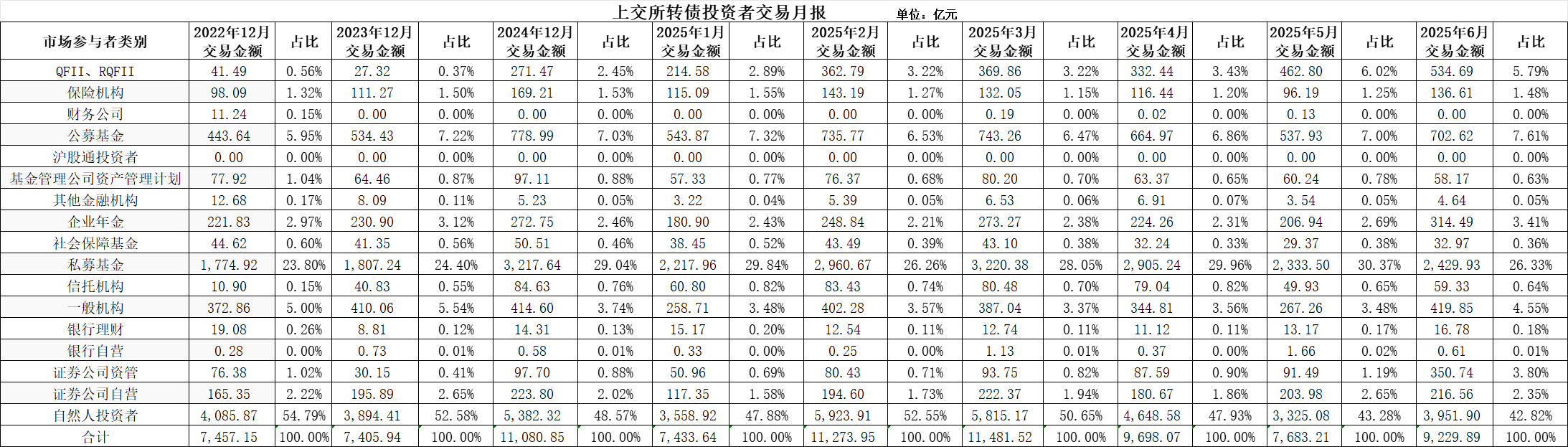 2025年6月,上交所转债投资者交易金额9,229.89亿元,其中公募基金交易金额占比7.61%,自然人投资者交易金额占比42.82%,企业年金交易金额占比3.41%,私募基金交易金额占比26.33%。