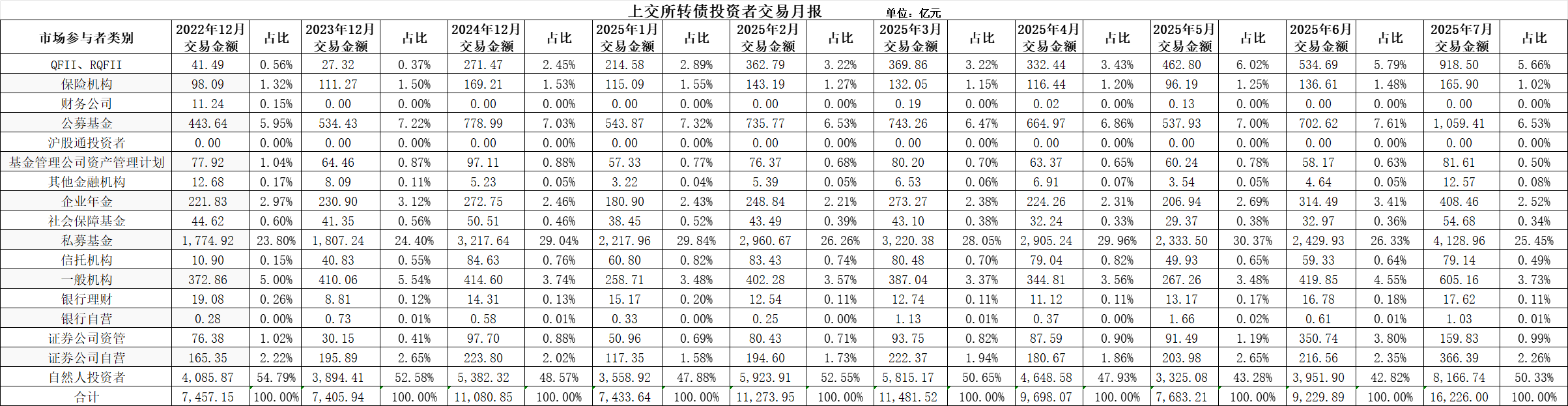 2025年7月,上交所转债投资者交易金额16,226.00亿元,其中公募基金交易金额占比6.53%,自然人投资者交易金额占比50.33%,企业年金交易金额占比2.52%,私募基金交易金额占比25.45%。