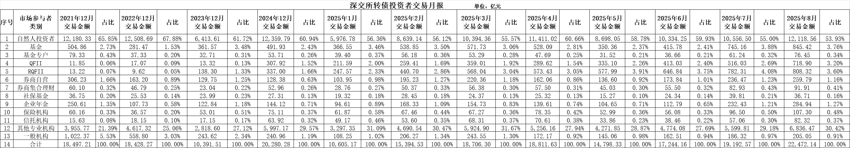 2025年8月,深交所转债投资者交易金额22,472.14亿元,其中基金(公募)交易金额占比3.76%,自然人投资者交易金额占比53.93%,企业年金交易金额占比1.27%,其他专业机构(私募)交易金额占比30.42%。