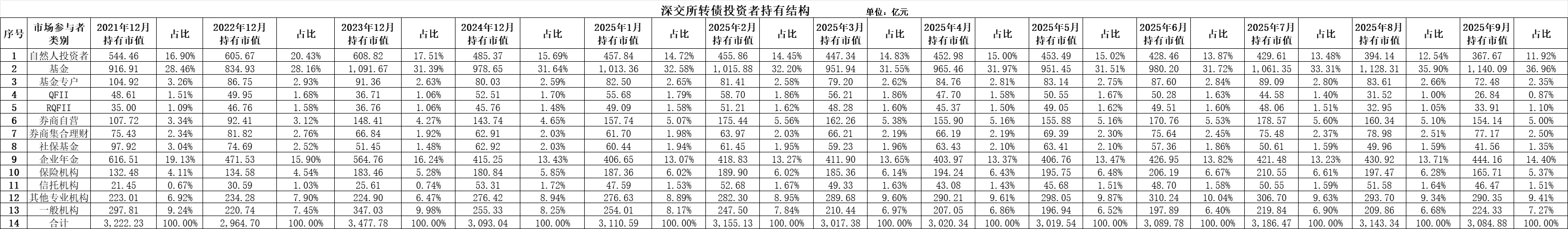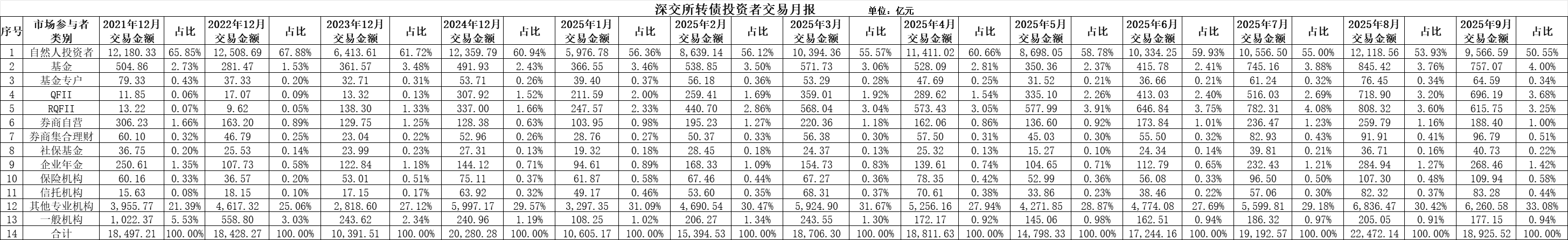 2025年9月,深交所转债投资者交易金额18,925.52亿元,其中基金(公募)交易金额占比4.00%,自然人投资者交易金额占比50.55%,企业年金交易金额占比1.42%,其他专业机构(私募)交易金额占比33.08%。