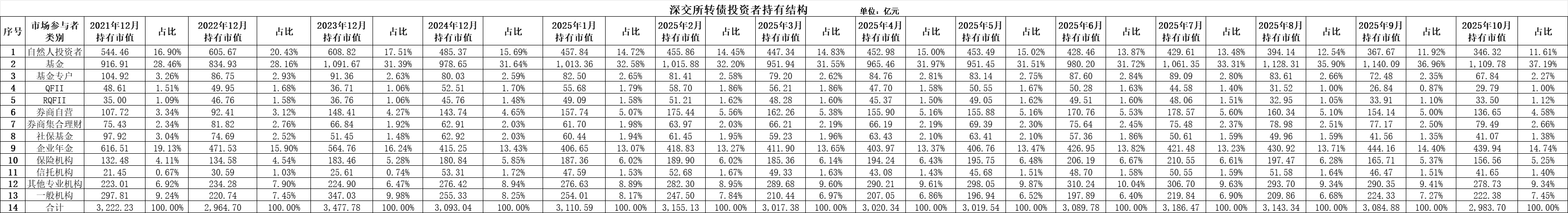 2025年10月,深交所转债投资者持有市值(债券市值)2,983.70亿元,其中基金(公募)持有市值占比37.19%,企业年金持有市值占比14.74%,自然人投资者持有市值占比11.61%,其他专业机构(私募)持有市值占比9.34%。