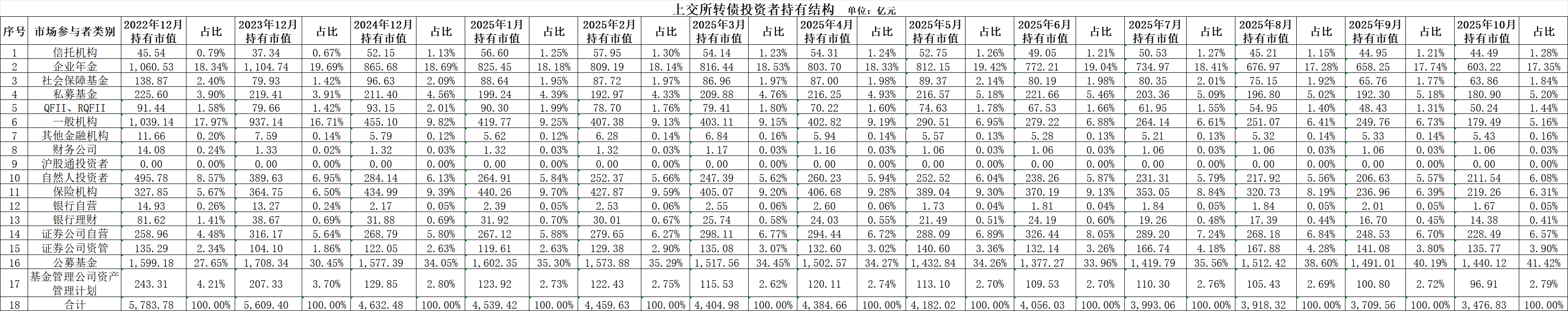 2025年10月,上交所转债投资者持有市值(债券面值)3,476.83亿元,其中公募基金持有市值占比41.42%,企业年金持有市值占比17.35%,自然人投资者持有市值占比6.08%,私募基金持有市值占比5.20%。