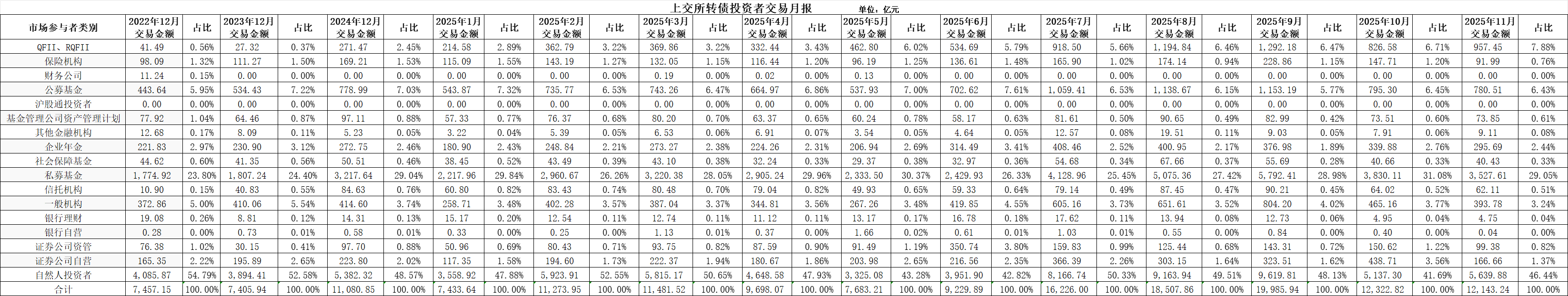 2025年11月,上交所转债投资者交易金额12,143.24亿元,其中公募基金交易金额占比6.43%,企业年金交易金额占比2.44%,自然人投资者交易金额占比46.44%,私募基金交易金额占比29.05%。