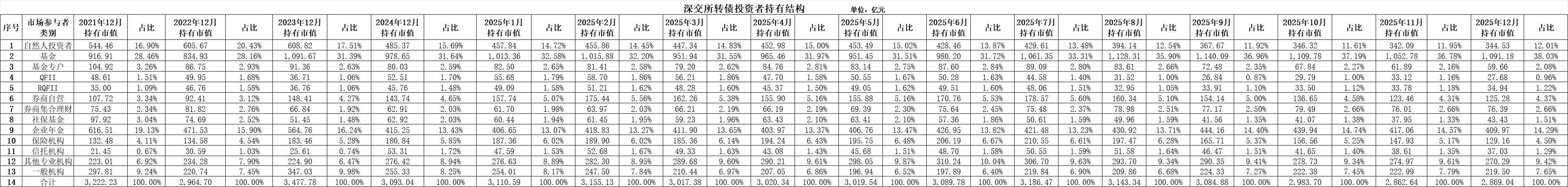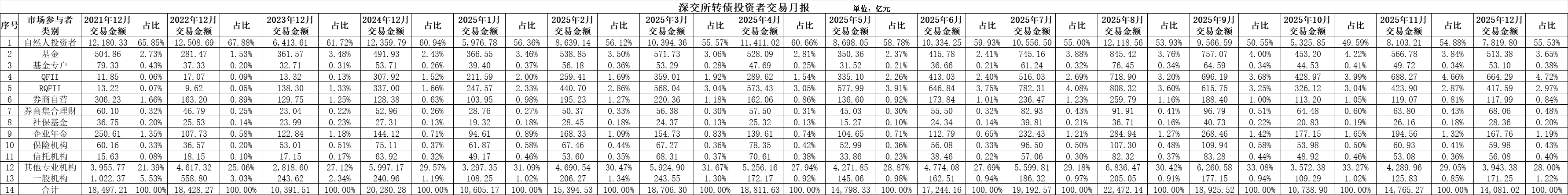 2025年12月,深交所转债投资者交易金额14,081.02亿元,其中基金(公募)交易金额占比3.65%,企业年金交易金额占比1.19%,自然人投资者交易金额占比55.53%,其他专业机构(私募)交易金额占比28.00%。
