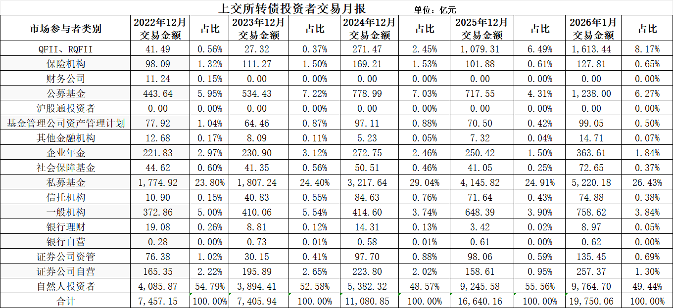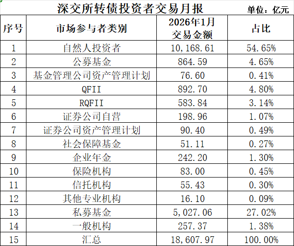 2026年1月,深交所转债投资者交易金额18,607.97亿元,其中公募基金交易金额占比4.65%,企业年金交易金额占比1.30%,自然人投资者交易金额占比54.65%,私募基金交易金额占比27.02%。