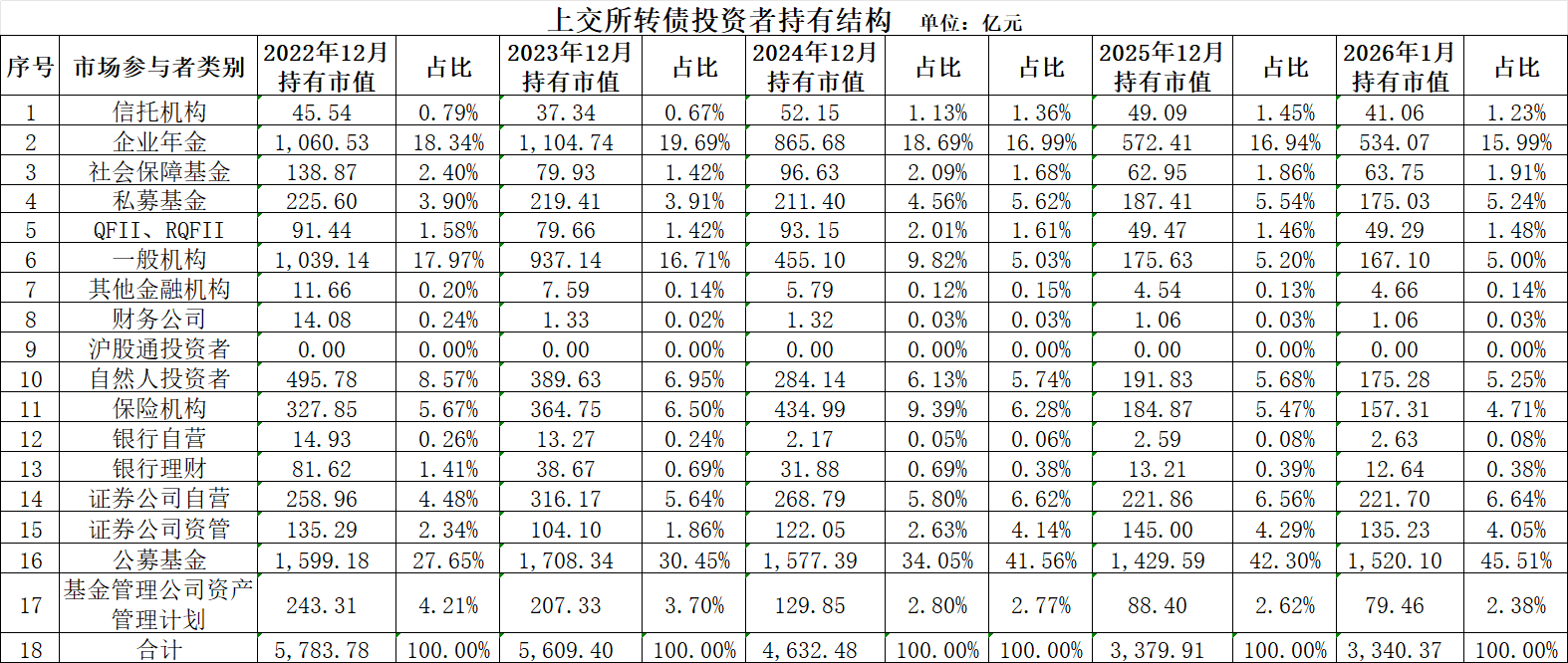 2026年1月,上交所转债投资者持有市值(债券面值)3,340.37亿元,其中公募基金持有市值占比45.51%,企业年金持有市值占比15.99%,自然人投资者持有市值占比5.25%,私募基金持有市值占比5.24%。2026年1月,上交所转债投资者交易金额19,750.06亿元,其中公募基金交易金额占比6.27%,企业年金交易金额占比1.84%,自然人投资者交易金额占比49.44%,私募基金交易金...个人投资者仅仅持有5.25%,交易却占到49%