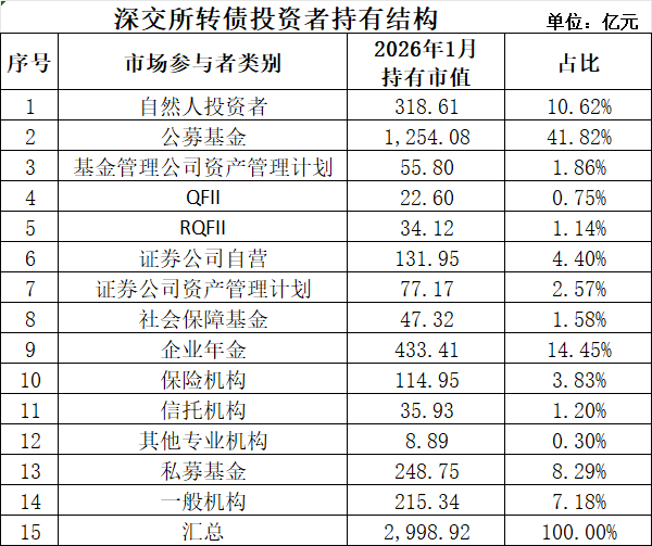 2026年1月,深交所转债投资者持有市值(债券市值)2,998.92亿元,其中公募基金持有市值占比41.82%,企业年金持有市值占比14.45%,自然人投资者持有市值占比10.62%,私募基金持有市值占比8.29%。
