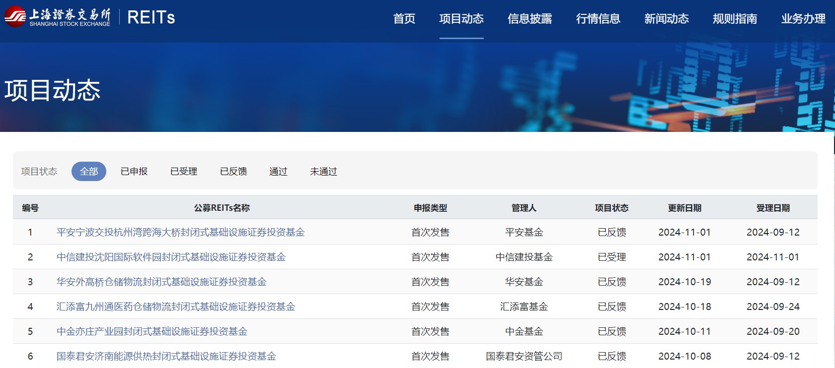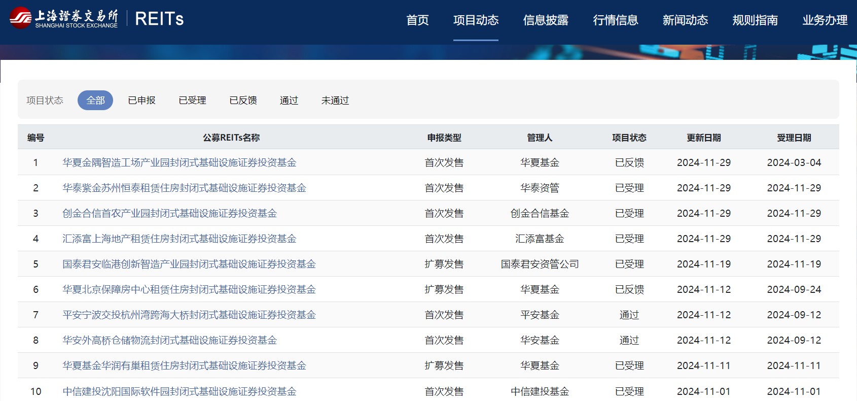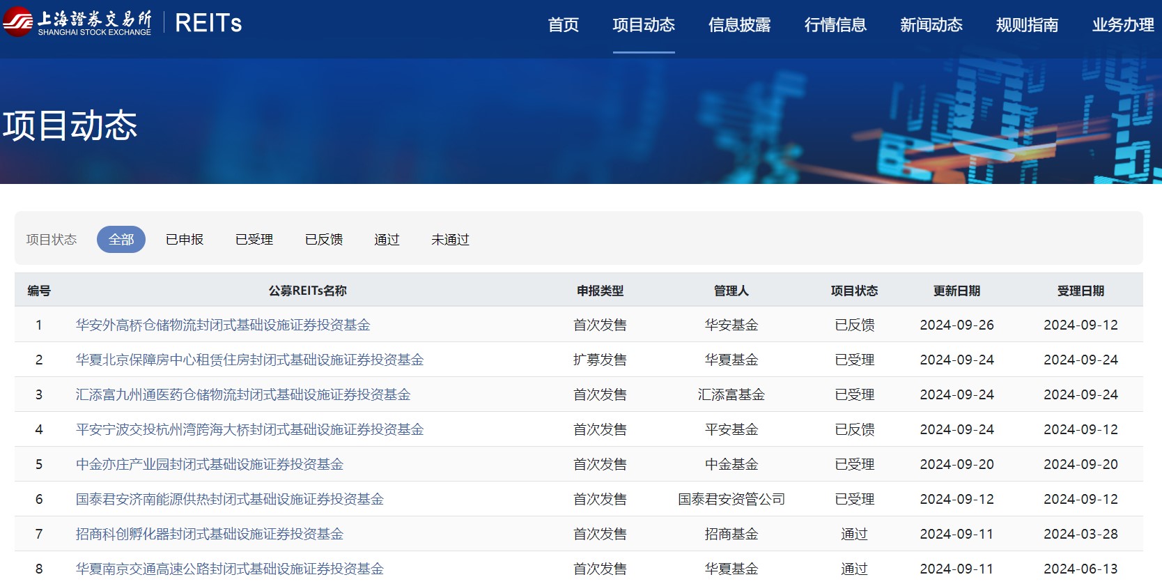 上海证券交易所有10个公募REITs:7个已上市交易、1个已受理,2个已反馈。