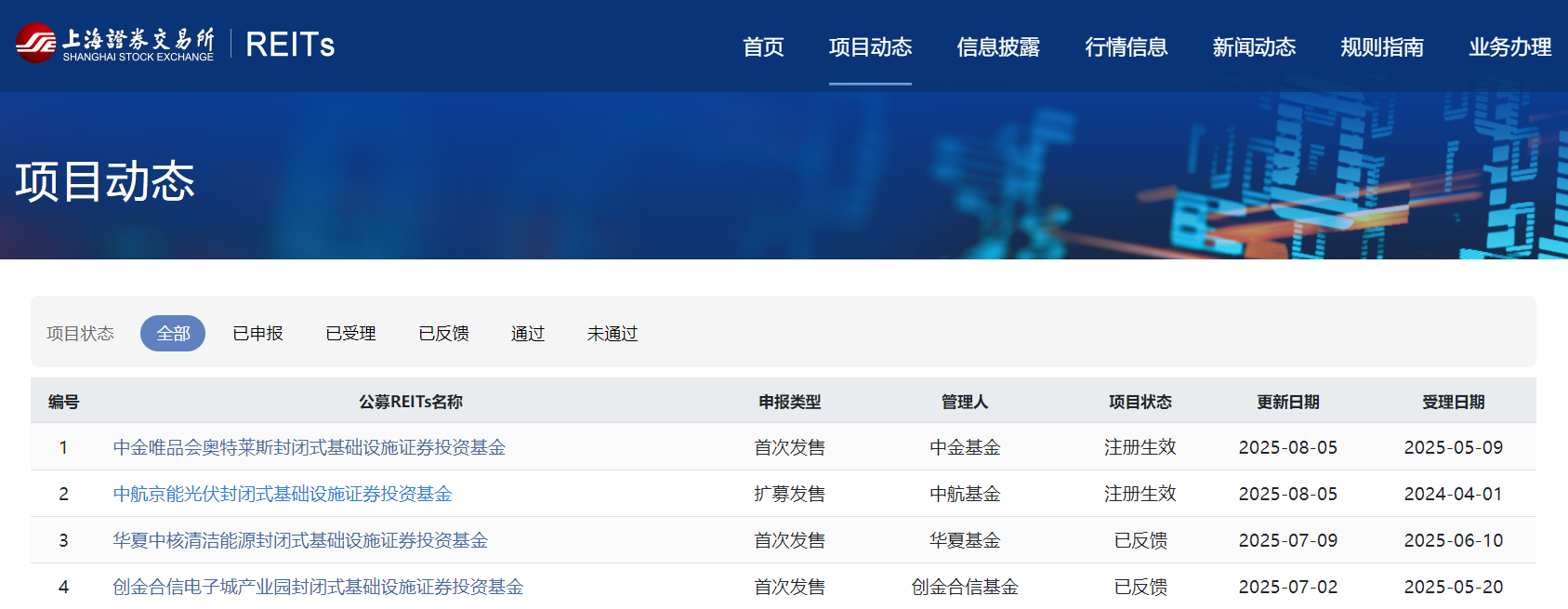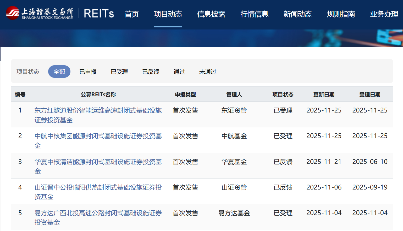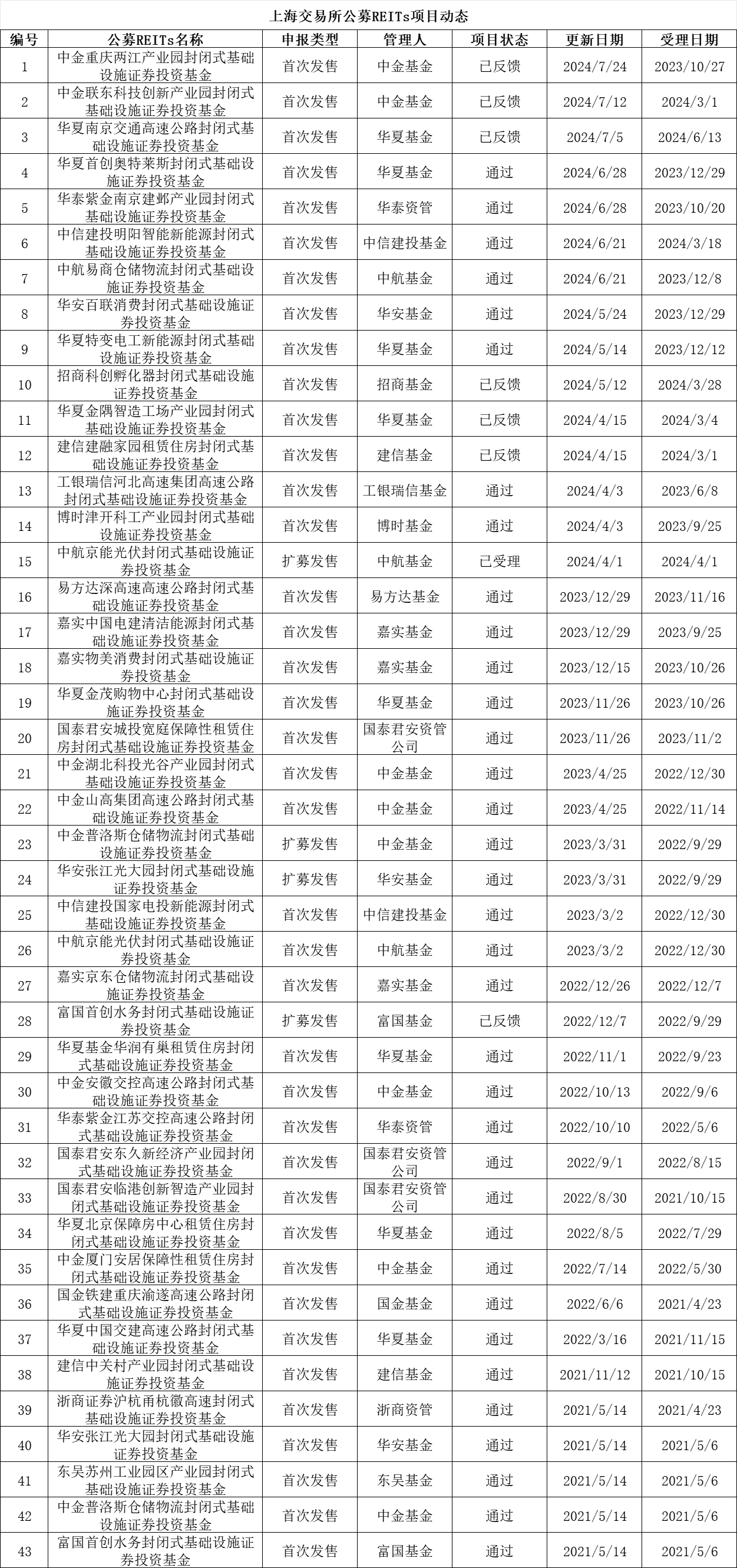 上海证券交易所有10个公募REITs:7个已上市交易、1个已受理,2个已反馈。