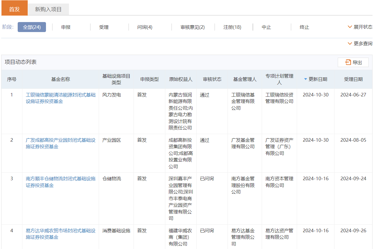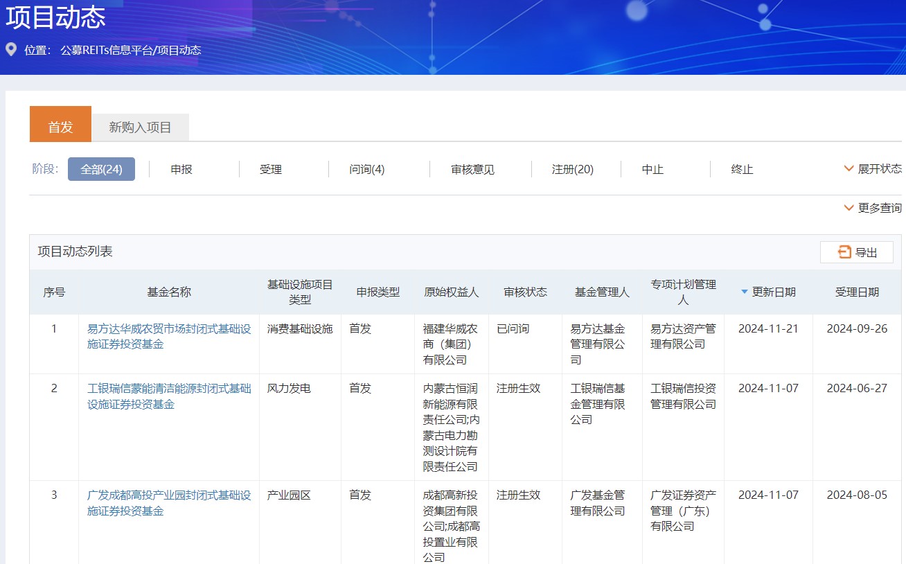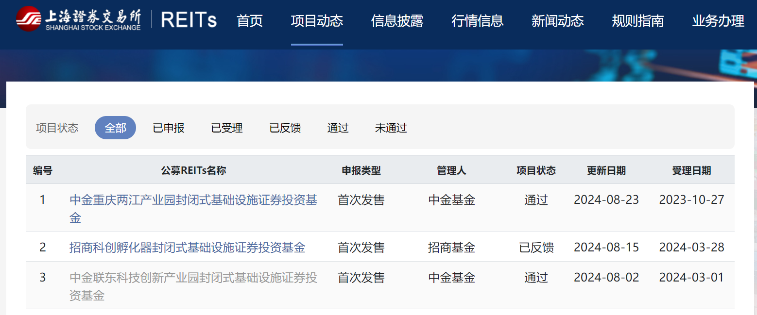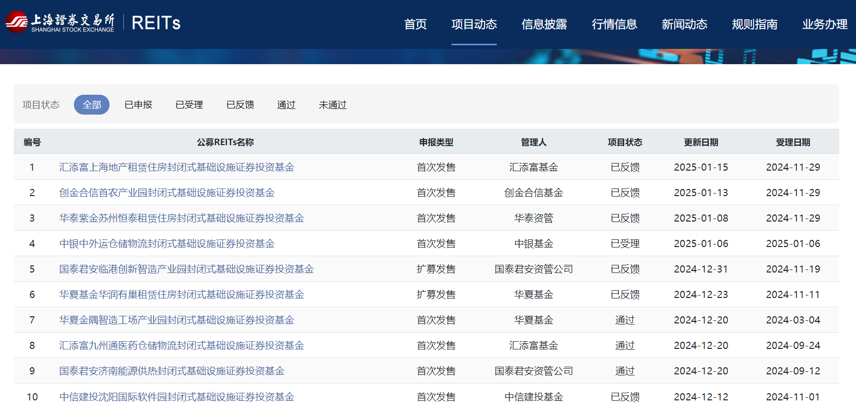 2024年12月,上海交易所公募REITs已反馈3支,通过3支。深圳交易所公募REITs注册生效1支。