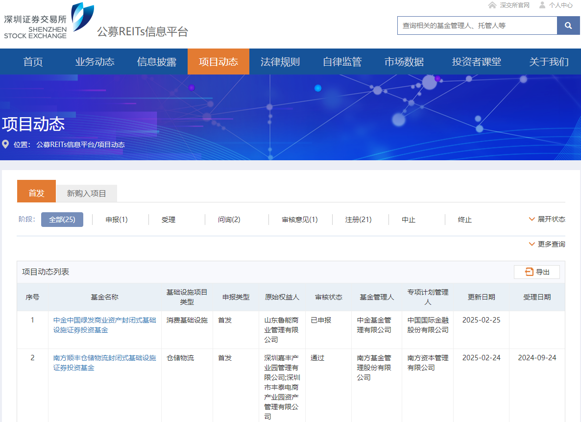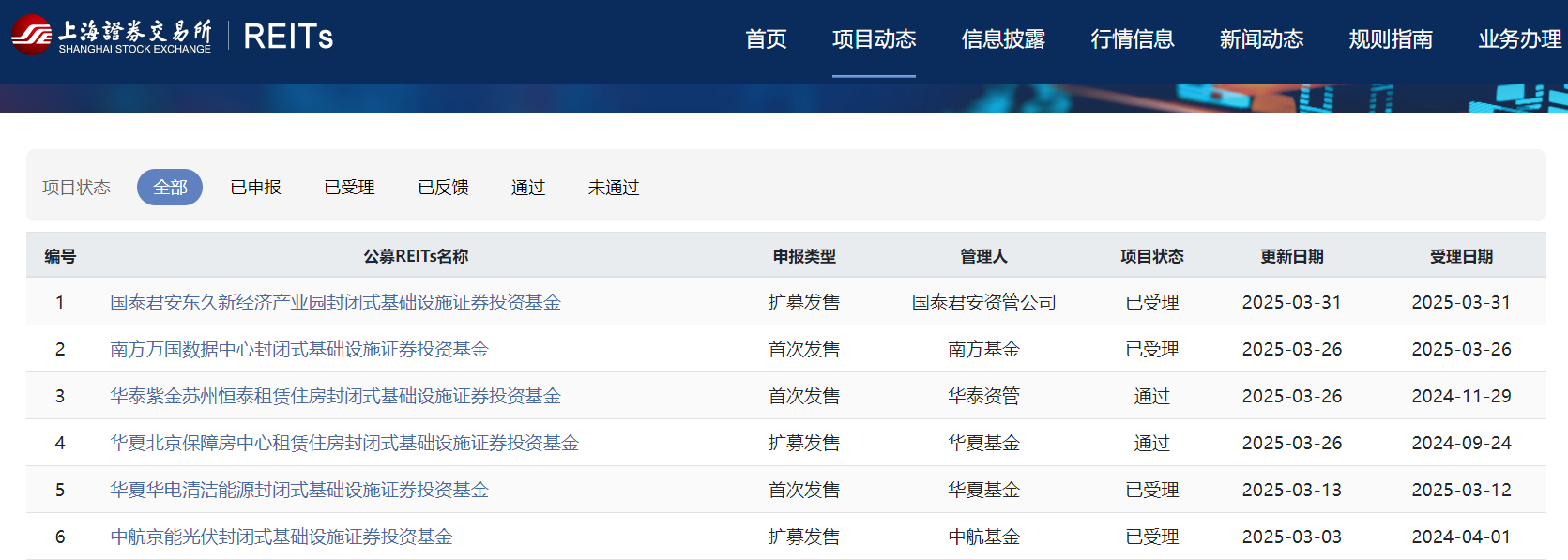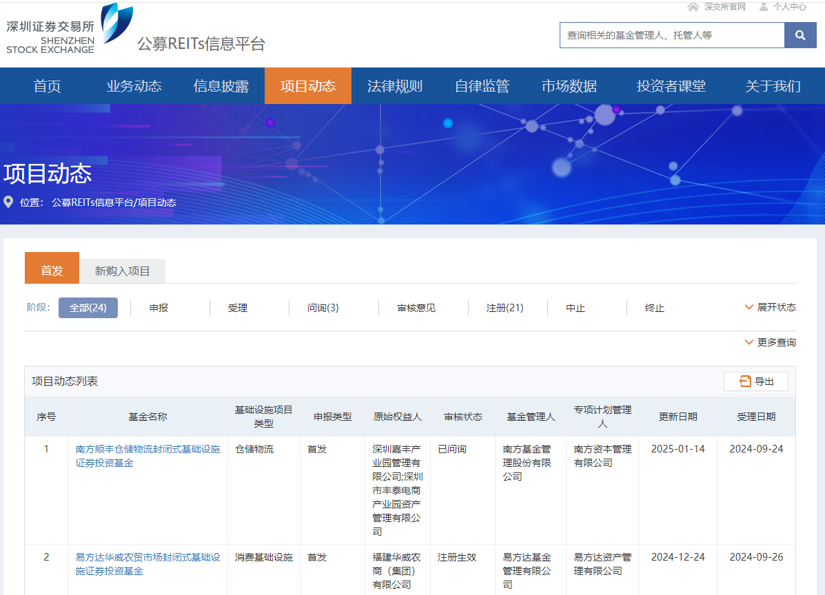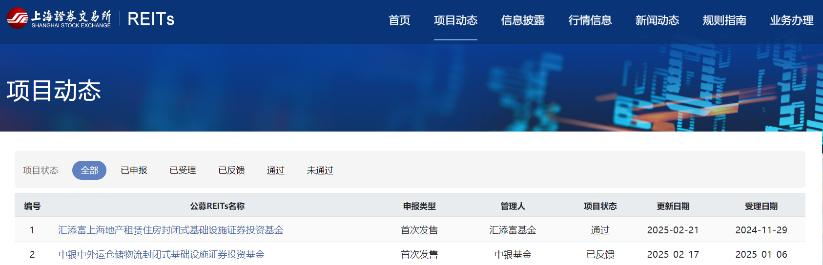 2025年1月,上海交易所公募REITs已受理1支,已反馈3支。深圳交易所公募REITs已问询1支。
