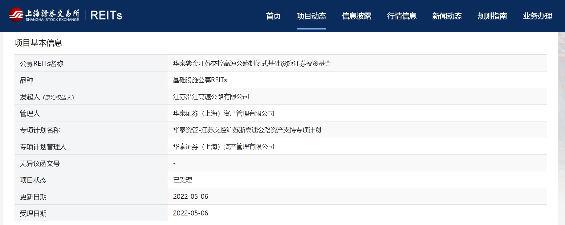 2022-05-06,华泰紫金江苏交控高速公路封闭式基础设施证券投资基金已受理。
