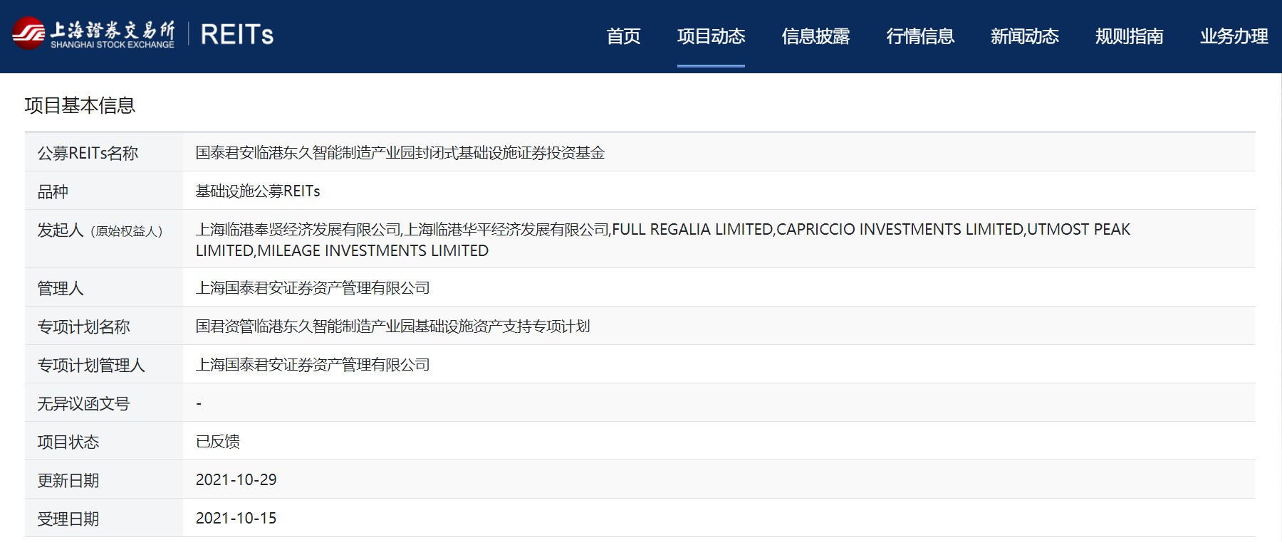 2021-10-29,国泰君安临港东久智能制造产业园封闭式基础设施证券投资基金已反馈。