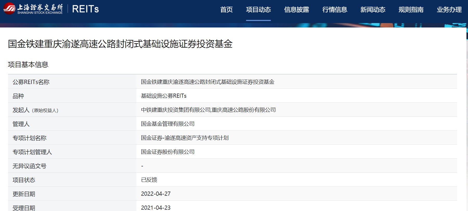 2022-04-27,国金铁建重庆渝遂高速公路封闭式基础设施证券投资基金已反馈。