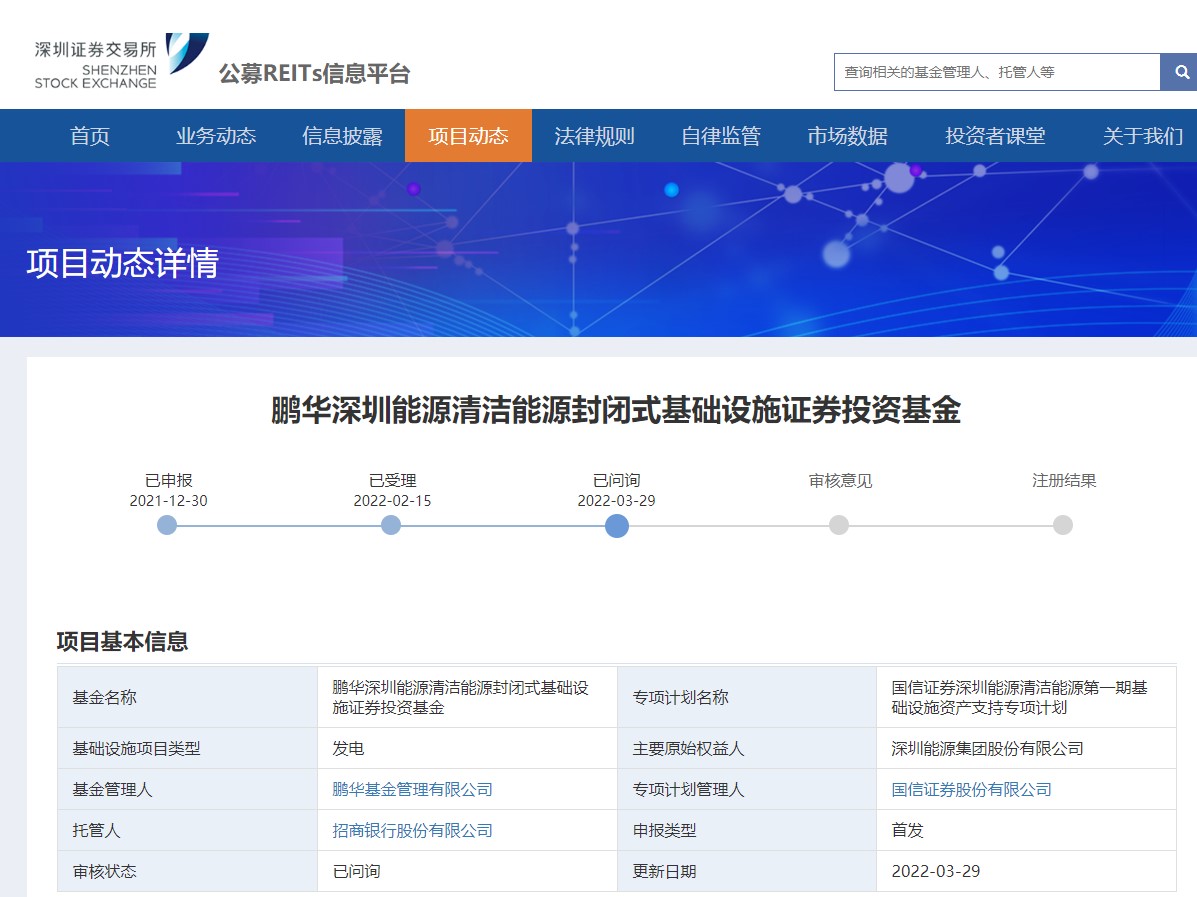 2022-03-29,鹏华深圳能源清洁能源封闭式基础设施证券投资基金已问询。