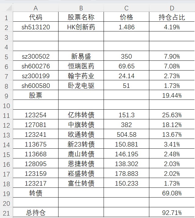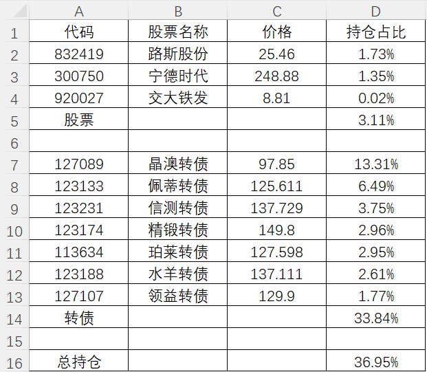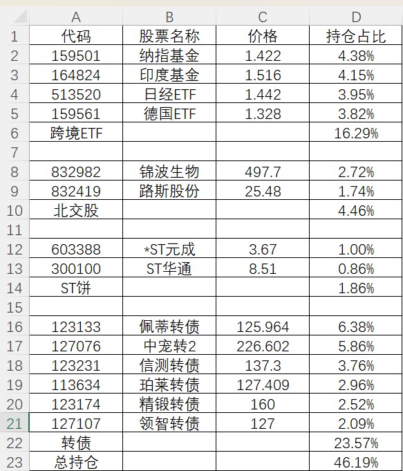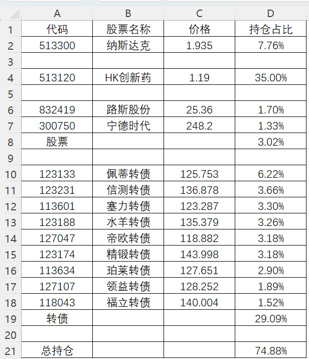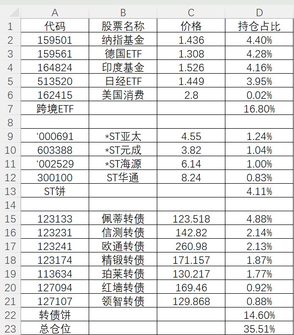 目前总仓位69.27%,转债占35.25%,QDII占24.37%,股票占9.43%,北交所新三板占0.22%,图里是详细持仓占比。