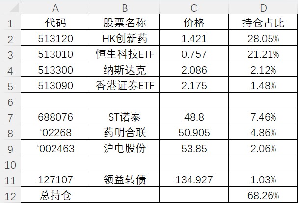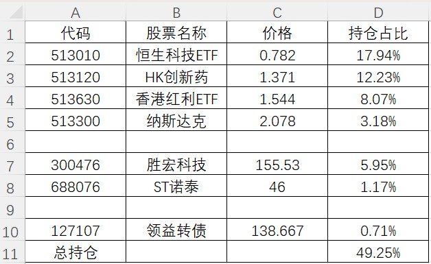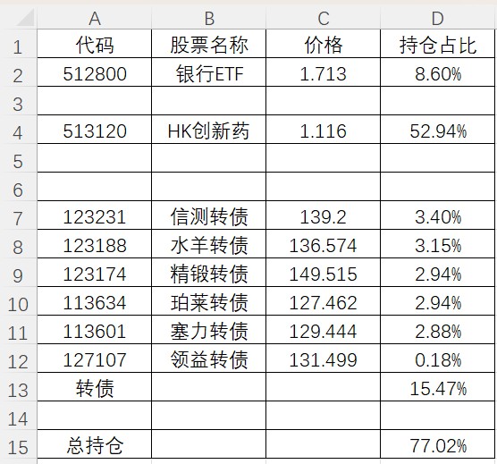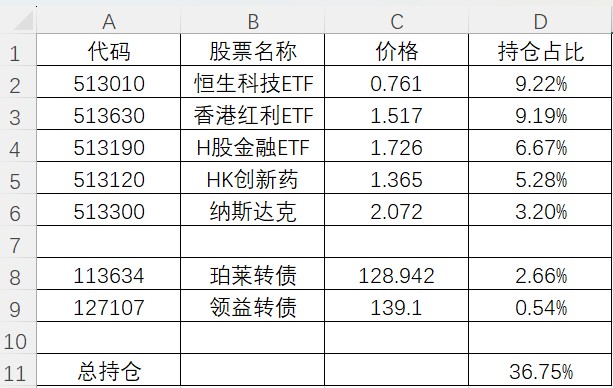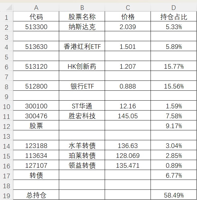 加仓了银行ETF,建仓了港股红利ETF,另外原来清仓的ST华通一直在涨,看着眼红,周四进去接盘了。