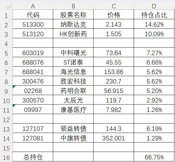 总仓位66.94%,持仓数量37只,其中还包括1个10张的华兴观察仓,等于实际持仓36只。