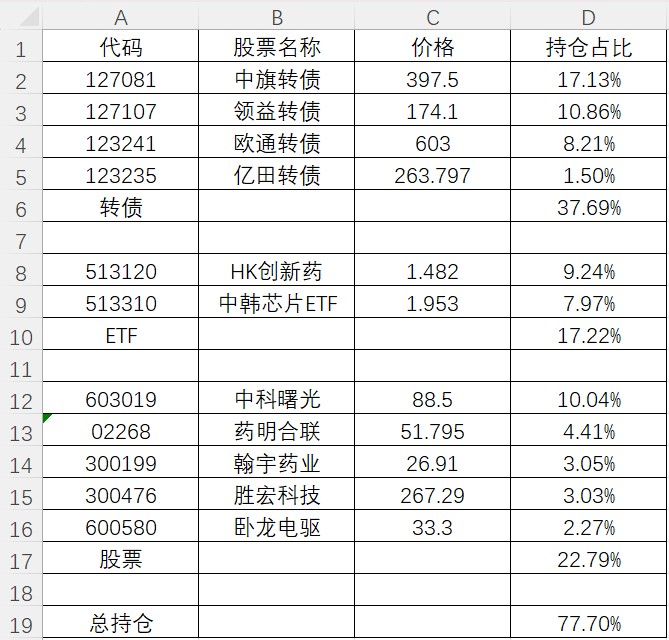 周初觉得涨太多,做了减仓,但后来加仓太早,目前持仓的转债大部分浮亏。