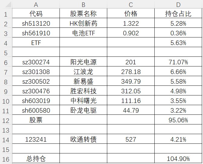 超额2.2%,得益于本周的阳光电源继续大涨和所有持仓都有高波动做T,另外新股西安奕材还没卖,不计入仓位。