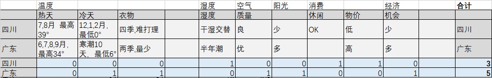 另外我还做了一个四川和广东的对照表,最后得出了宜居分数分别是3分和5分,还是广东高一些: