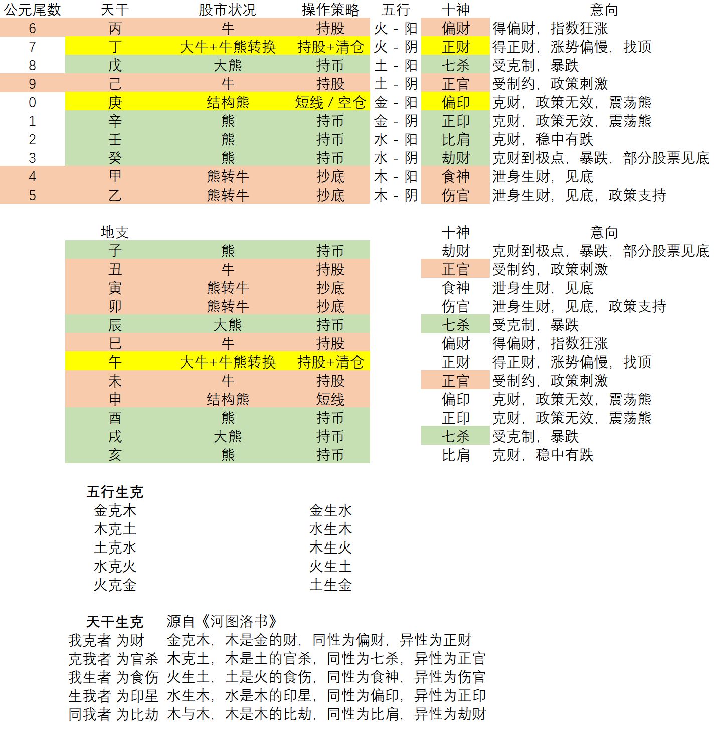 然后,我就去网上找到了该书的PDF版本。2016年,经济管理出版社发行了一本作者名为胡斐的书,书名《股票操盘宝典》。这本书的第一章第三节《股市推背图:未来60年中国股市的周期推演》,推算了2016年以后未来60年(1个甲子)的A股股市演化进程。我做了摘要(详情参见最后的附表)。比较有意思的是,他的书和2021年国盛证券发的研报《天干地支在择时中的应用初探》,都是用壬水来给A股定属性的;但在后面的预测中,两者的结果大相径庭 —— 从年度走势看,胡斐的书给出的结果明显更准。