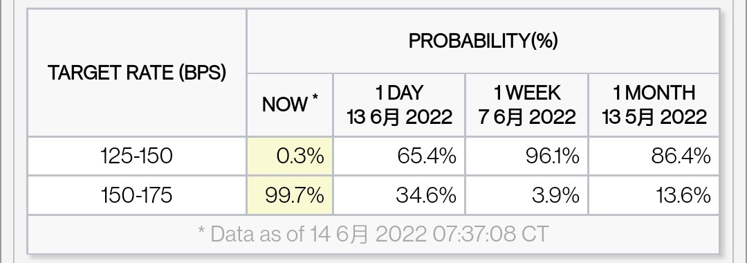 这个概率是前几天看的,据说昨天加75bp的概率都到99%了,剩下的是加100bp,加50bp的概率为0。美联储除了2020年3月疫情影响,在非议息日就把利率降到0以外,其他时间基本都是明牌的。