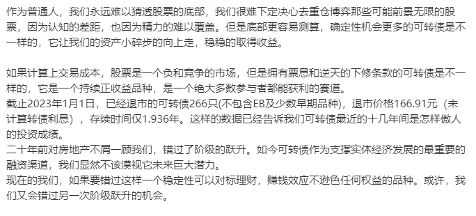 整体而言,转债摊大饼投资是所有的投资类型中比较简单的,适合我们所有普通散户投资,无论是全职还是兼职,无论资金量大或者小,无论投资经验丰富与否,到目前为止,转债还是很好的投资品种,而且乐观的说在2023年会比2022年好做一些,有可能的风险是跑不过股票.