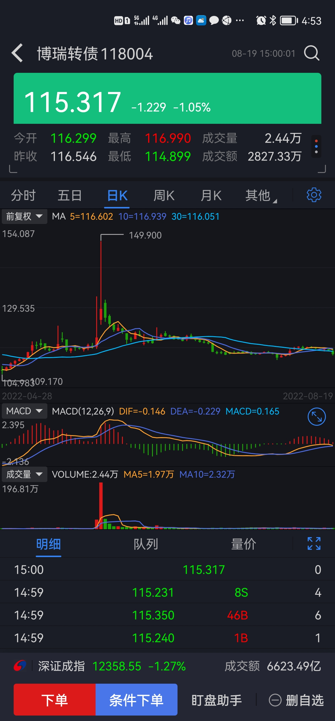 目前持仓前5: 博杰 游族 华正 博瑞 正丹 ,都是便宜货,最贵的才113元,我太偏执于低价了。另外,嘉元这个转债如何?我看它一直在历史低价徘徊。