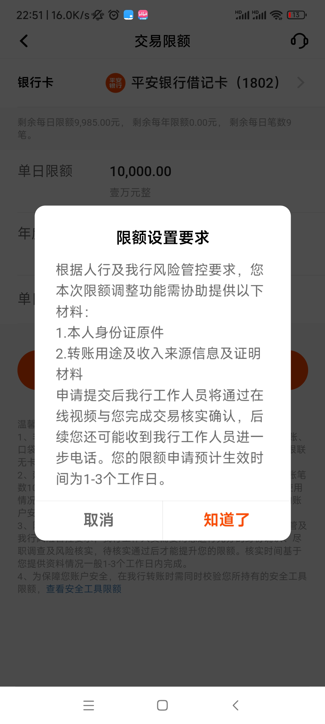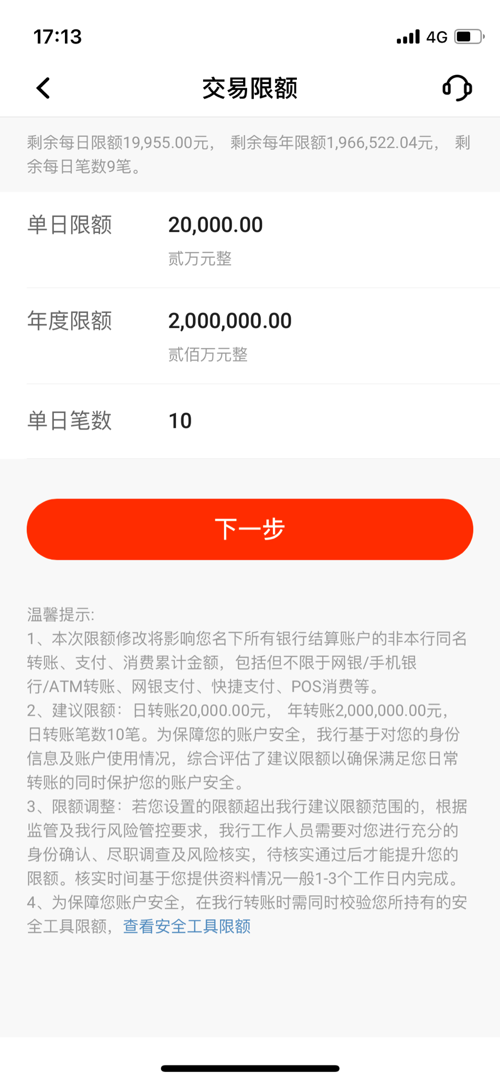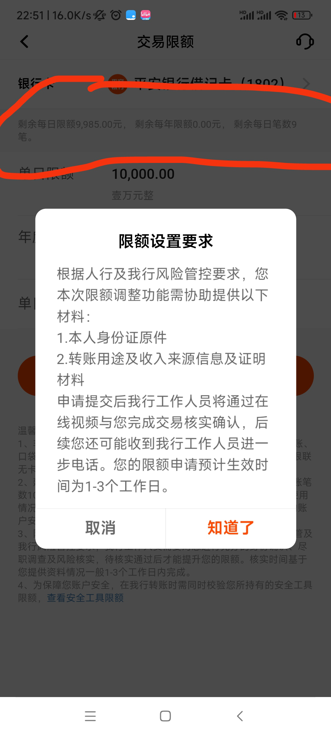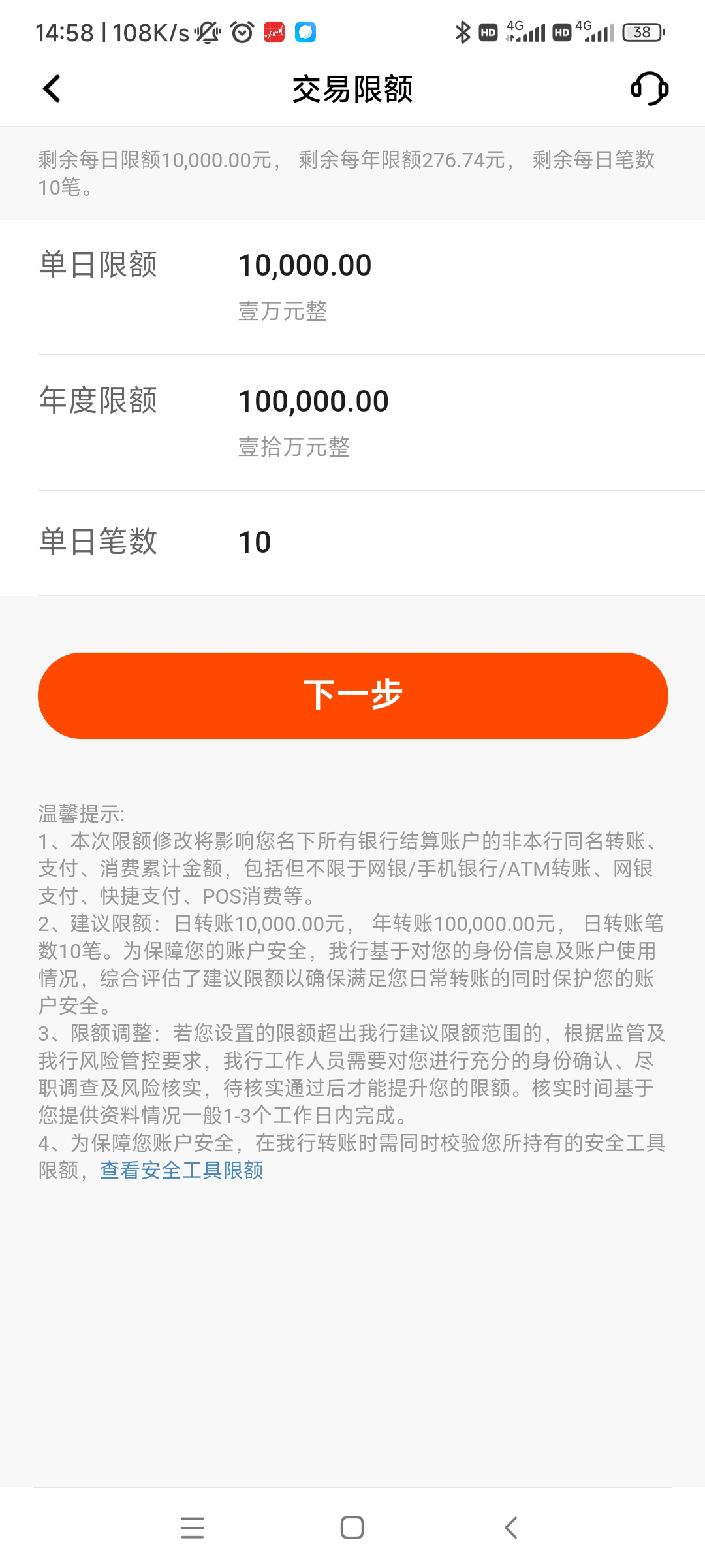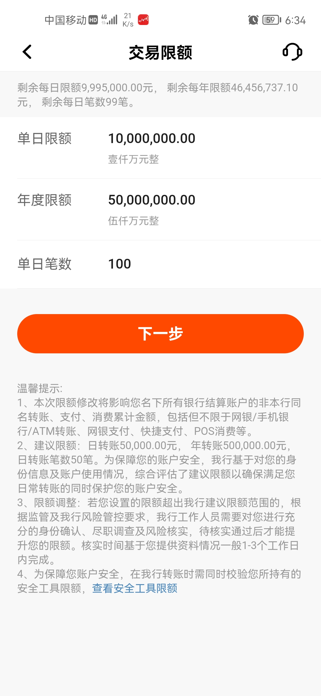 我呸,然后我最近这一两个月经常转账,经常存钱,今天,我发现我可以自助调额了(之前5000万一年是极限了,不能自主调),我可以调成1天1000万,一年10亿,然后我今天把一年调成10亿了(已经通过)