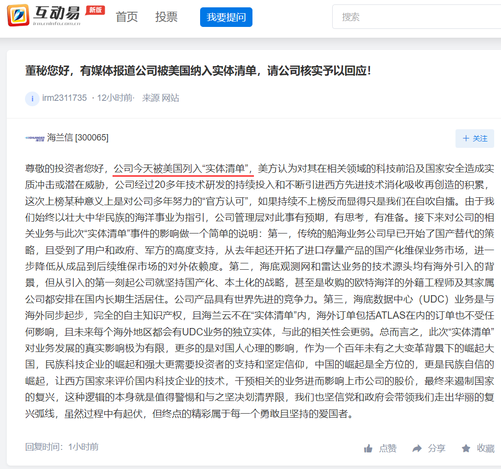 2,海兰信:公司回应被美国列入“实体清单”