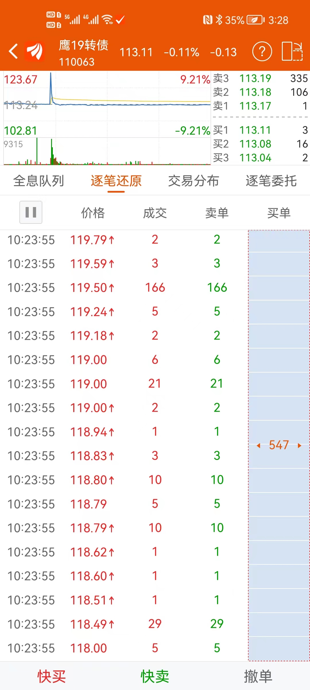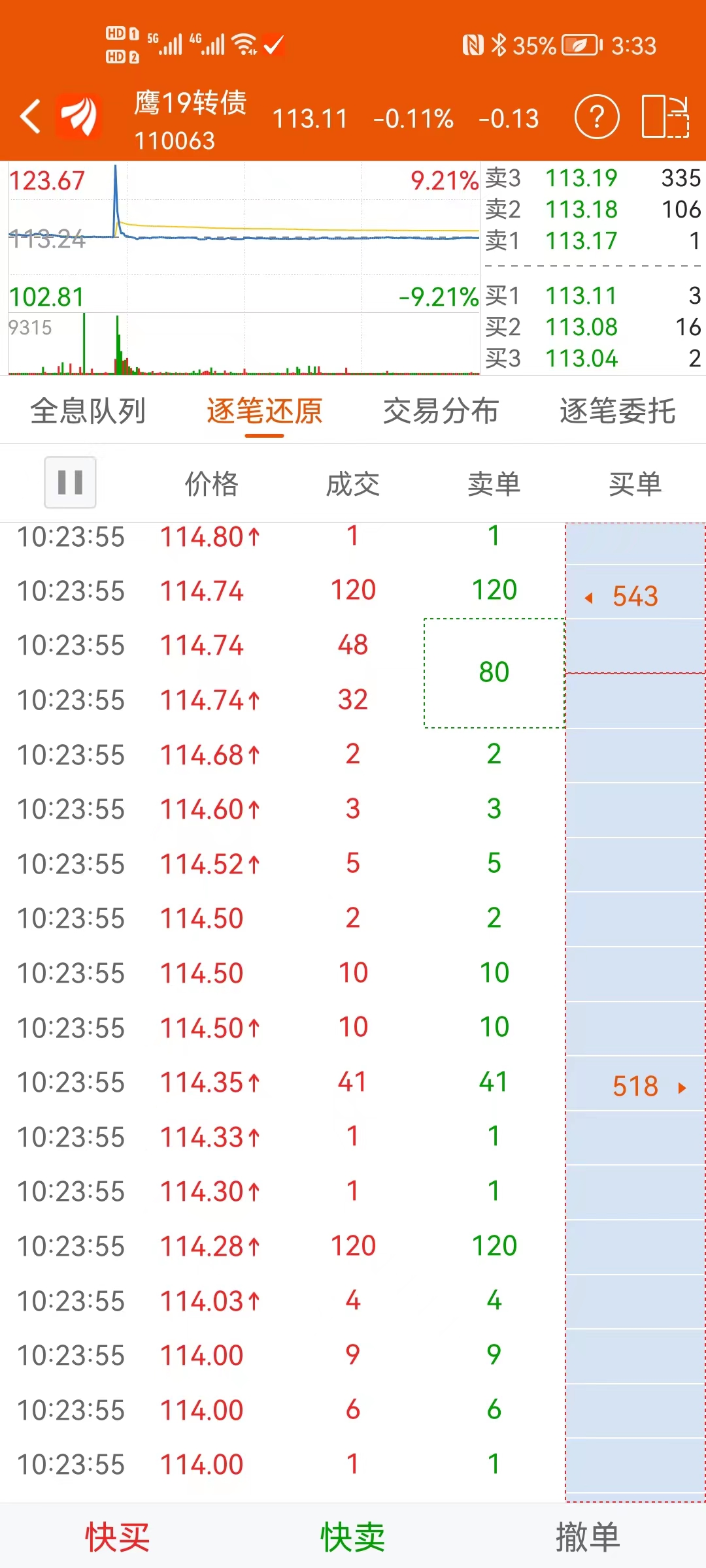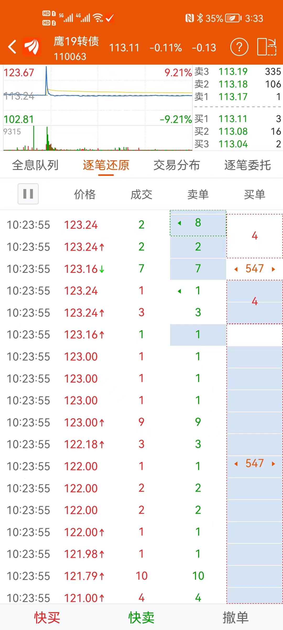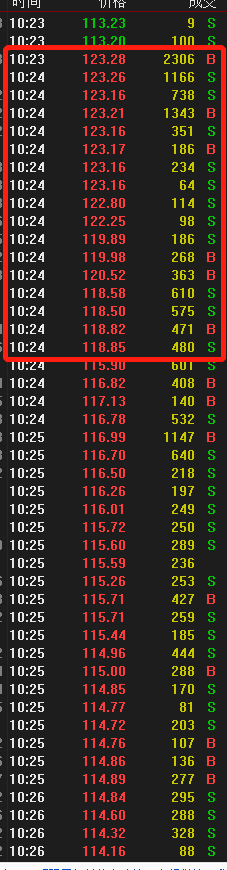 上面五单都是主动买单,在1秒内完成,价格从113拉高到了123