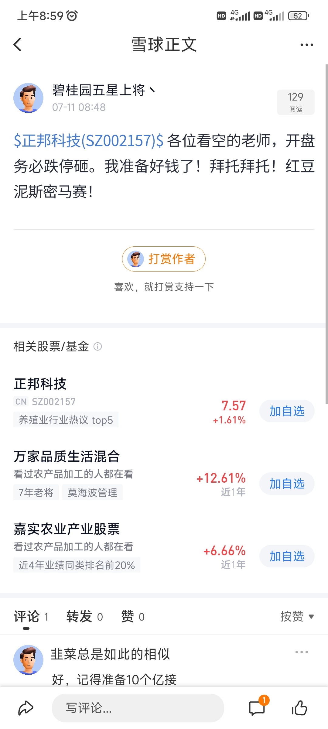 刚刚看了一份研报,研报里给了一个非常非常非常重要的线索,让我坚信目前缺母猪,我猜正邦还有优质母猪。我希望明天暴跌,好给我买入的机会,这次真真正正的加满。要是暴跌,明天把余额宝里的生活费都转过去!