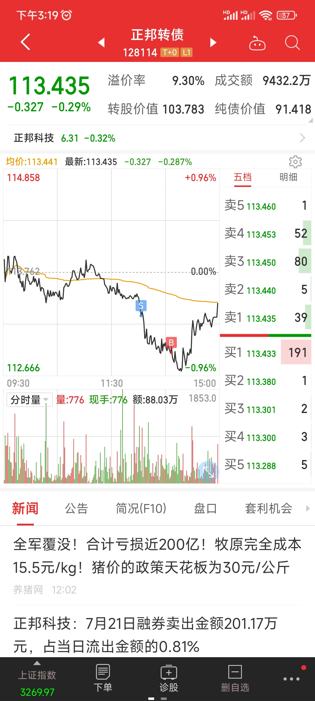 我尾盘所有正邦全出了,结合host老师建议,目前行情来自资金纯炒作概率大,遇到一点什么事情会马上崩,甚至我深深怀疑负溢价就是公司为了转股刻意的