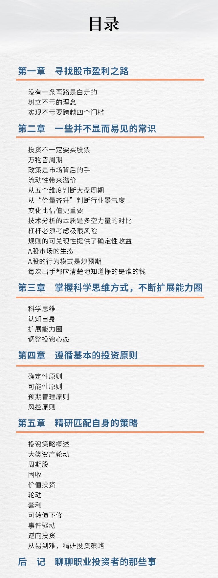 本书围绕这五大基石,对一些重要的知识点进行了详细论述:如何判断大盘周期?如何判断行业周期?价投为什么更应该关注变化而不是估值?技术分析应该怎么用?杠杆应该怎么用?如何用规则构建套利策略?博弈要考虑哪些东西?如何应用确定性原则和可能性原则?如何排雷?如何进行风控?最后,本书介绍了30多个投资策略,并结合我们自身的投资实践详细介绍了其中9个策略。