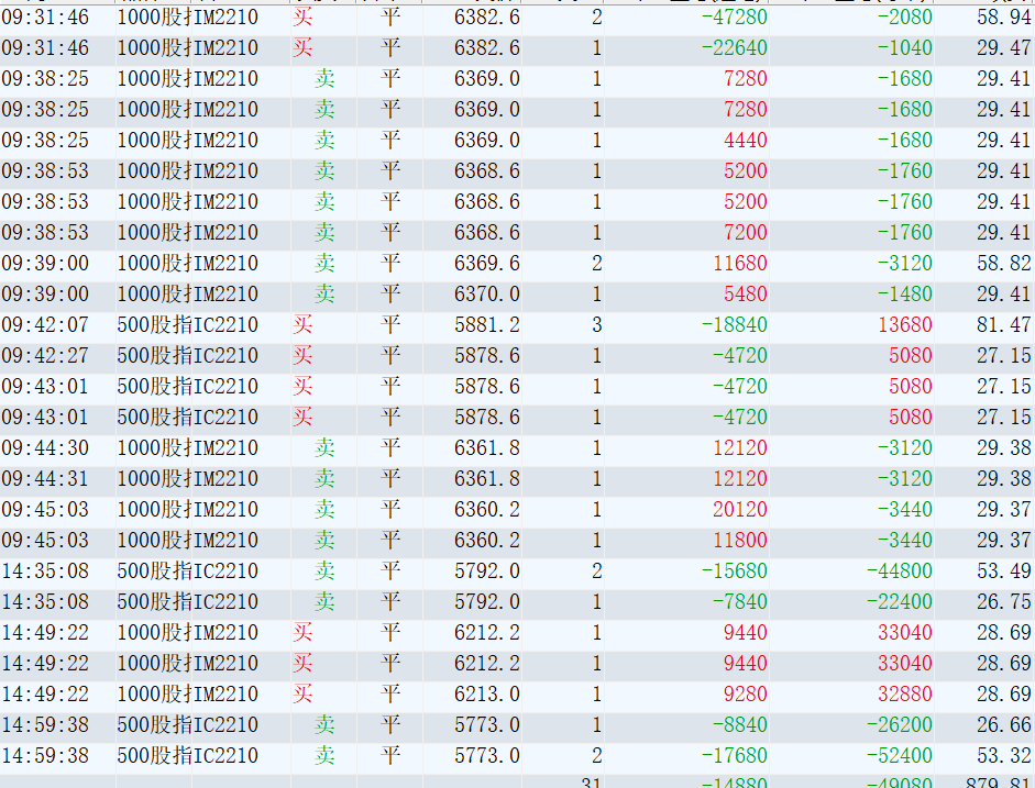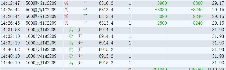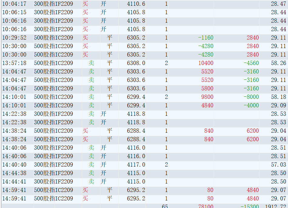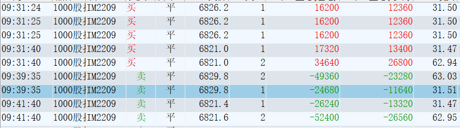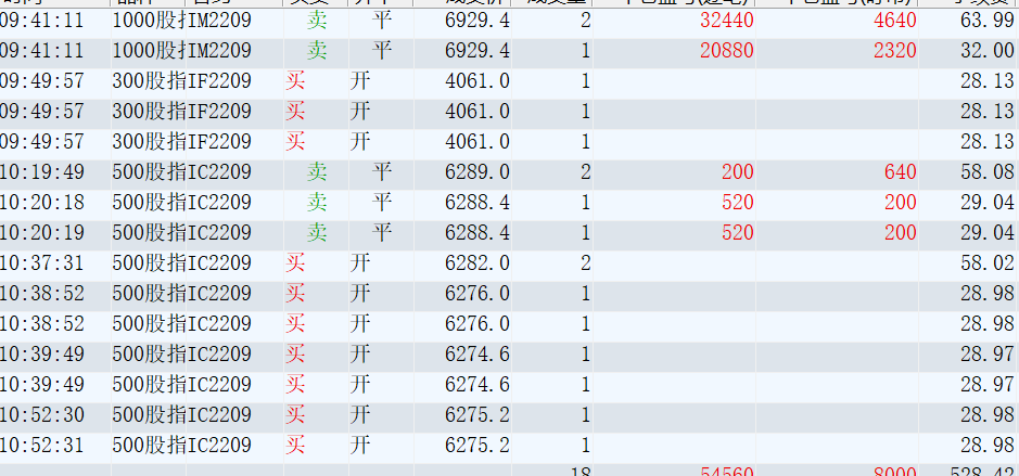 今天开盘抢50空头,等了30秒发现500/1000没跌,马上抢500多头,多空利润浮盈,等到午盘开盘下跌,先平逆势500再平顺势50。不用熬,舒服的一天。