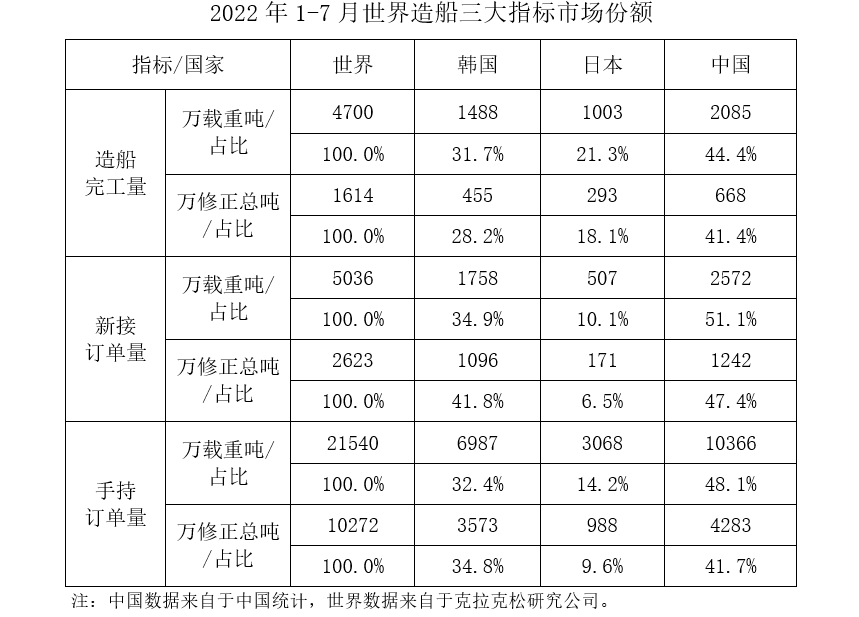 1~7月,我国造船完工量、新接订单量、手持订单量分别占世界市场份额的44.4%、51.1%和48.1%