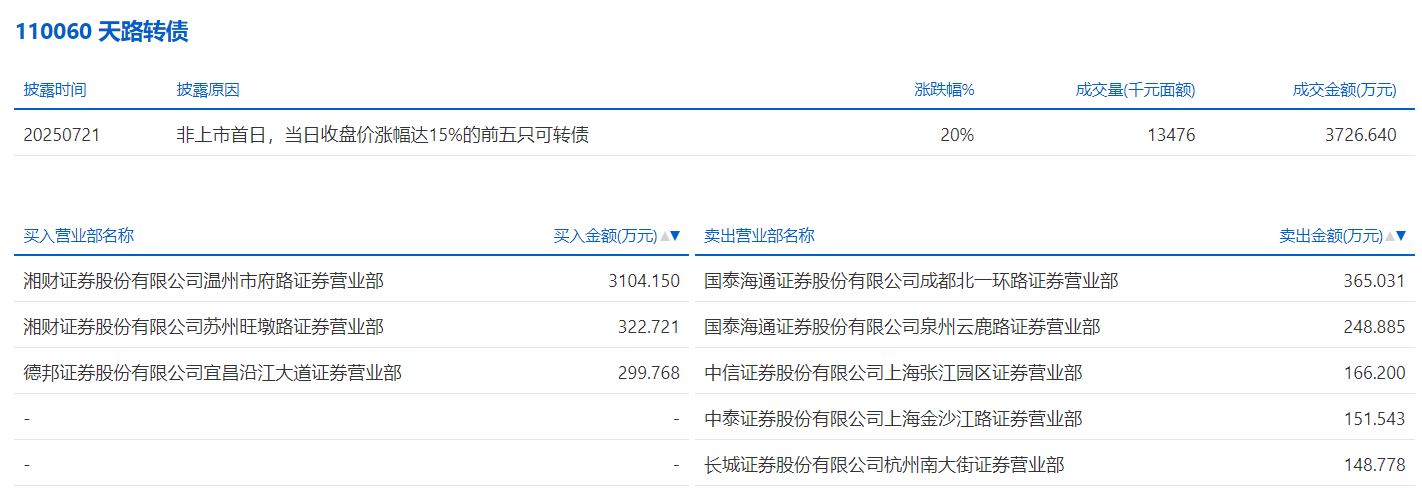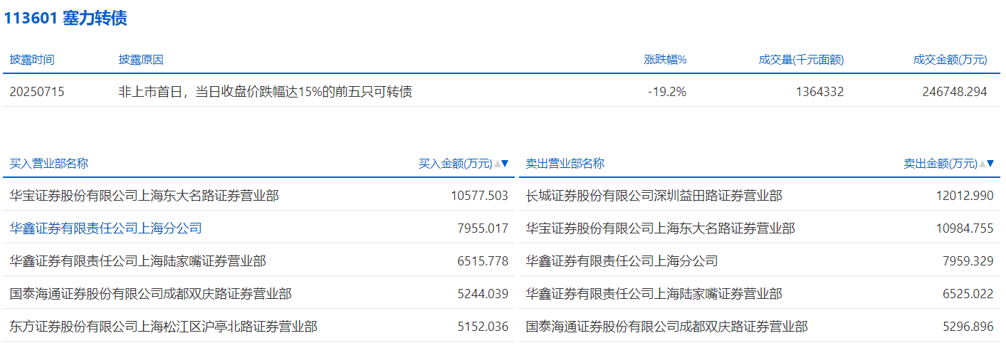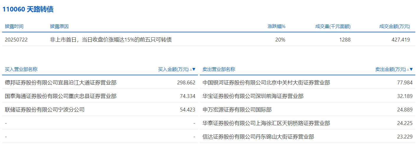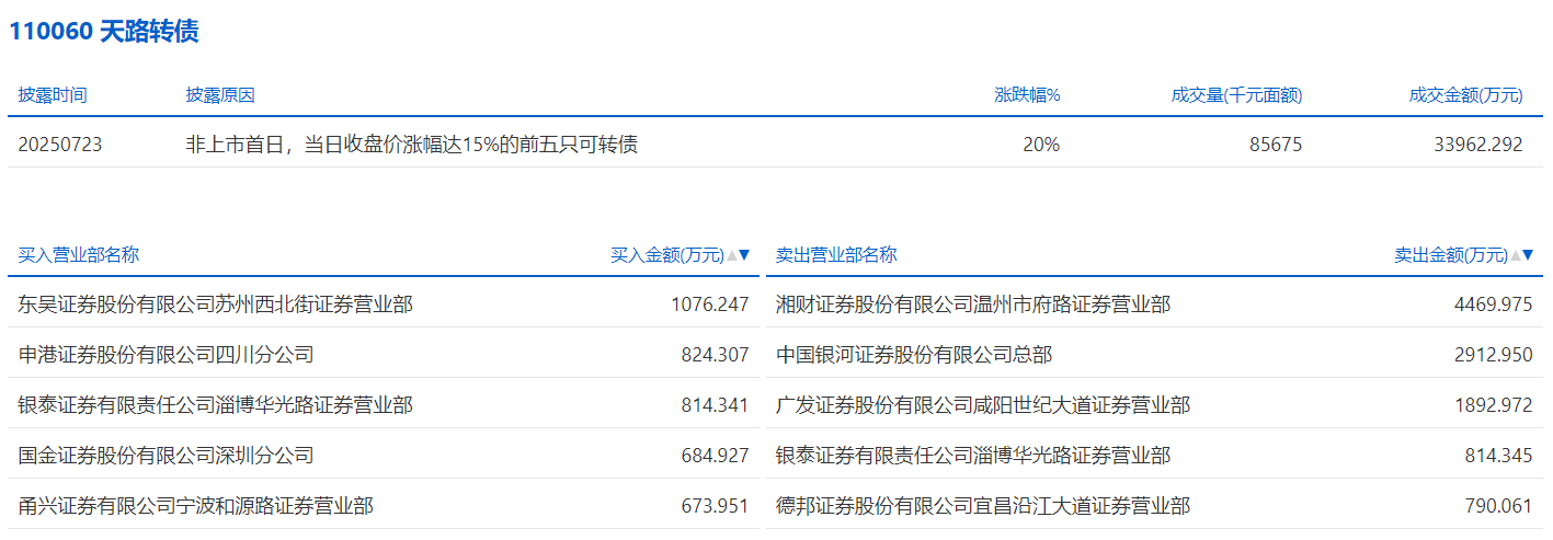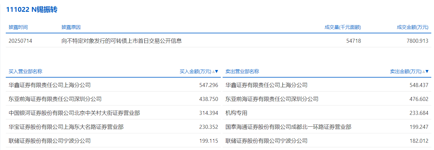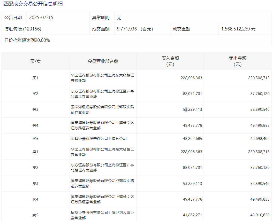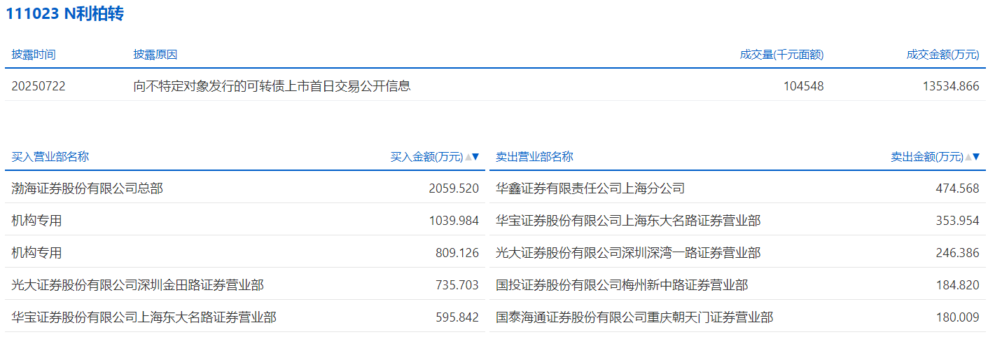 2025年7月15日,上交所可转债龙虎榜有1支转债,深交所可转债龙虎榜有1支转债。