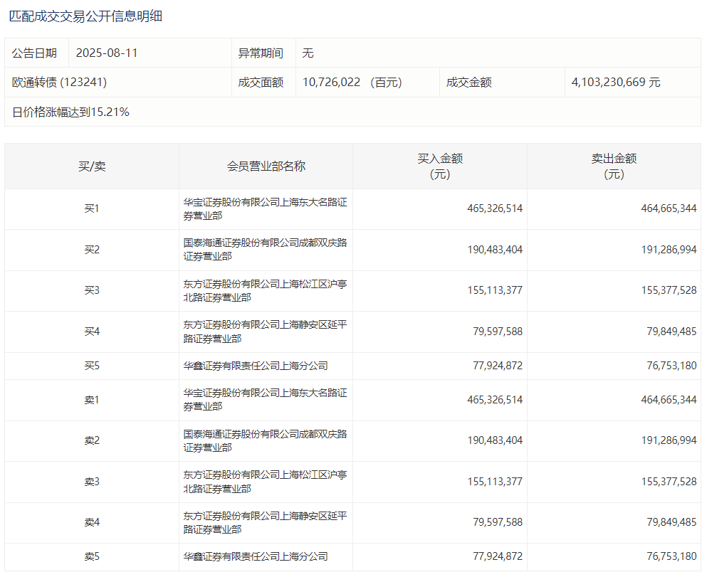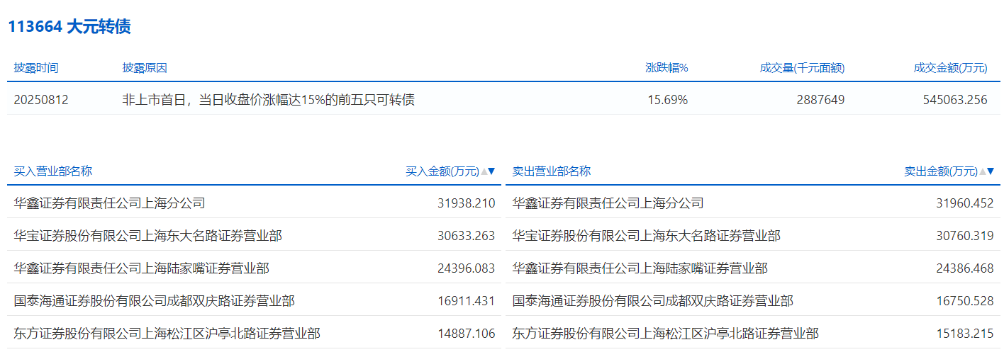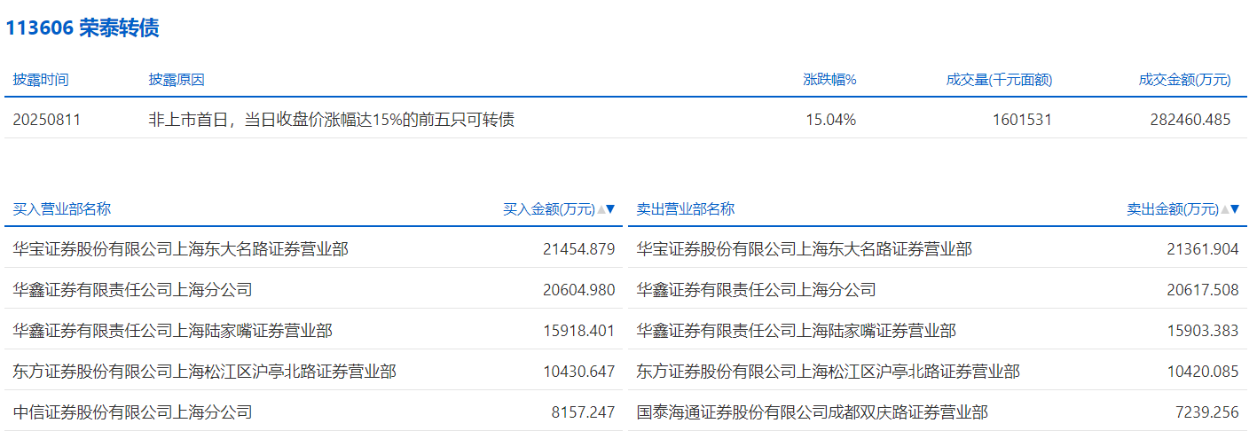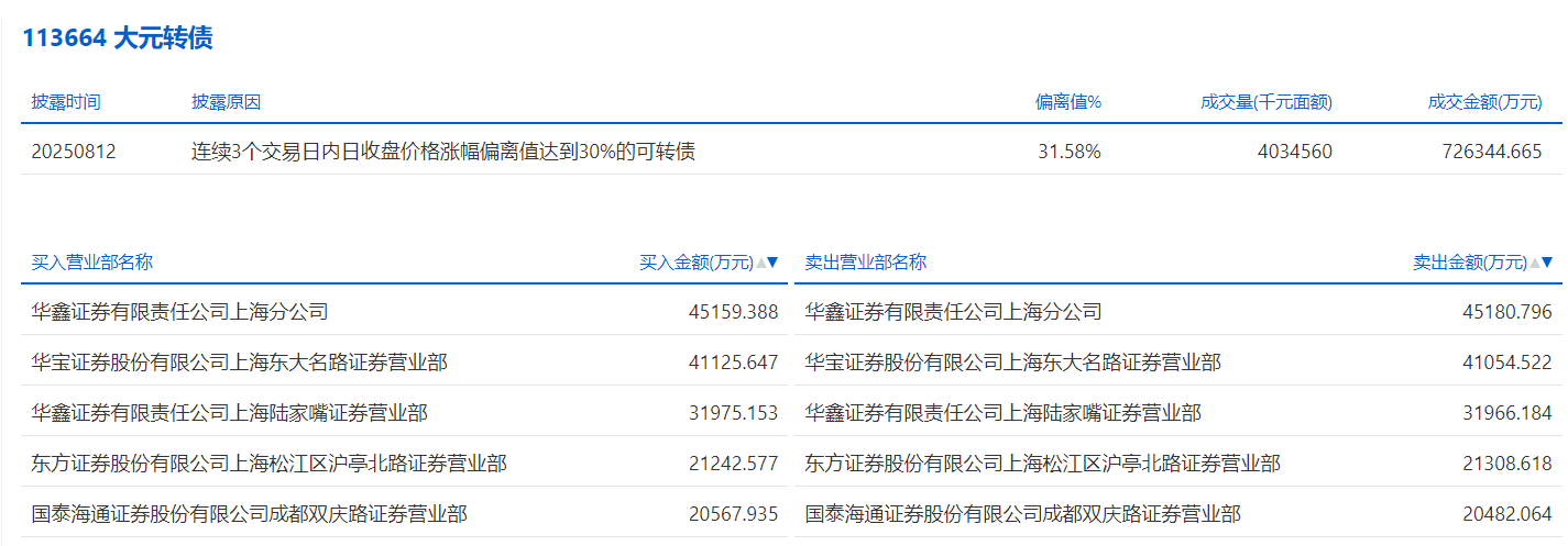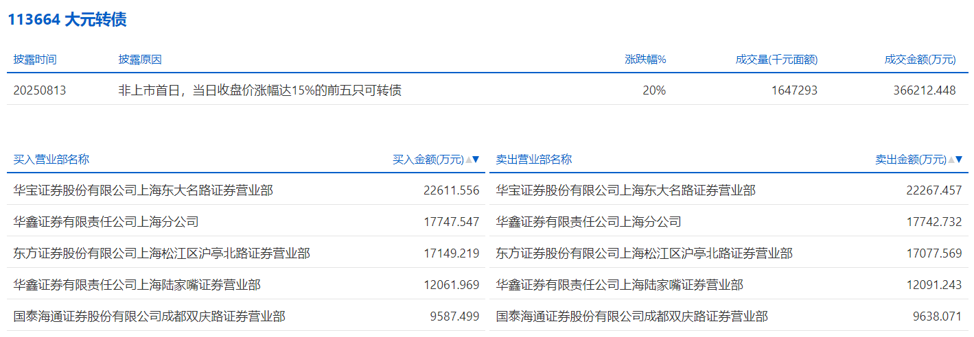 2025年8月11日,上交所可转债龙虎榜有1支转债,深交所可转债龙虎榜有2支转债。