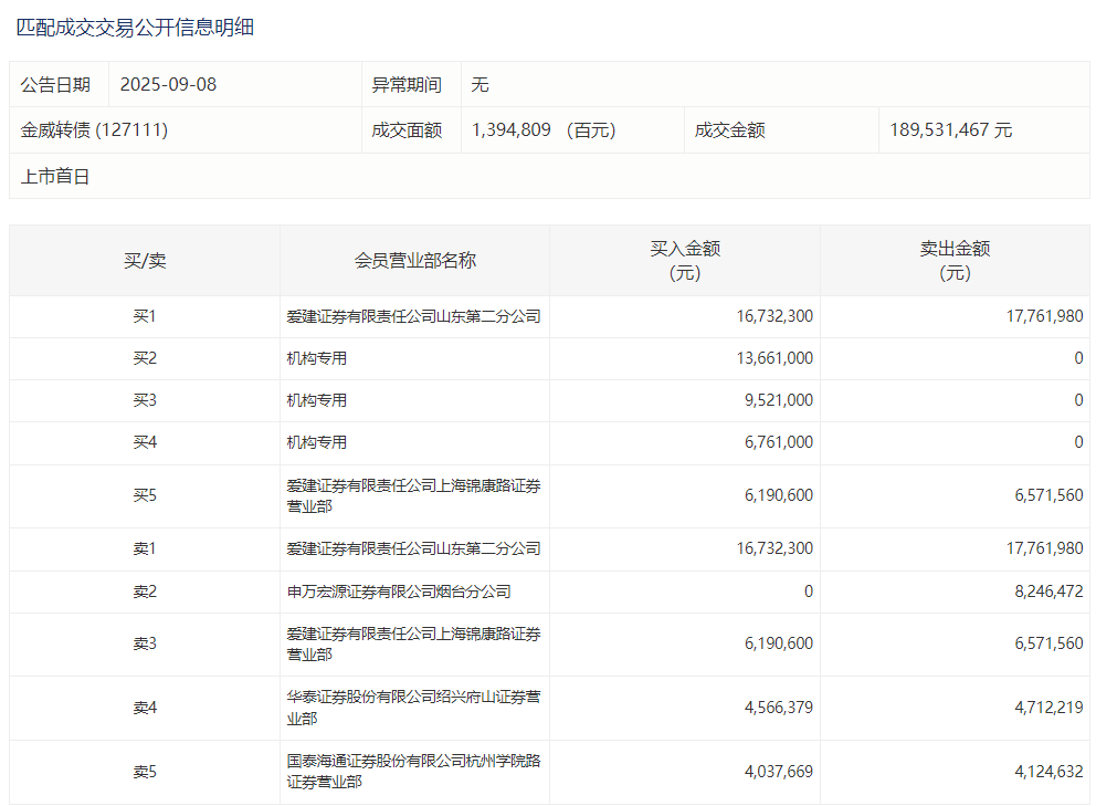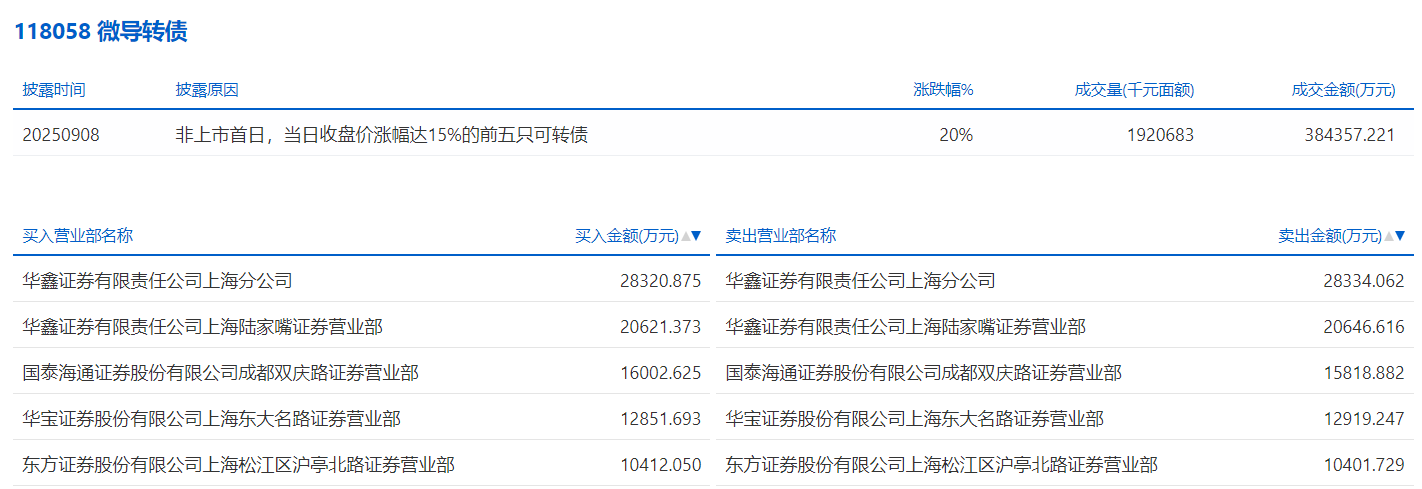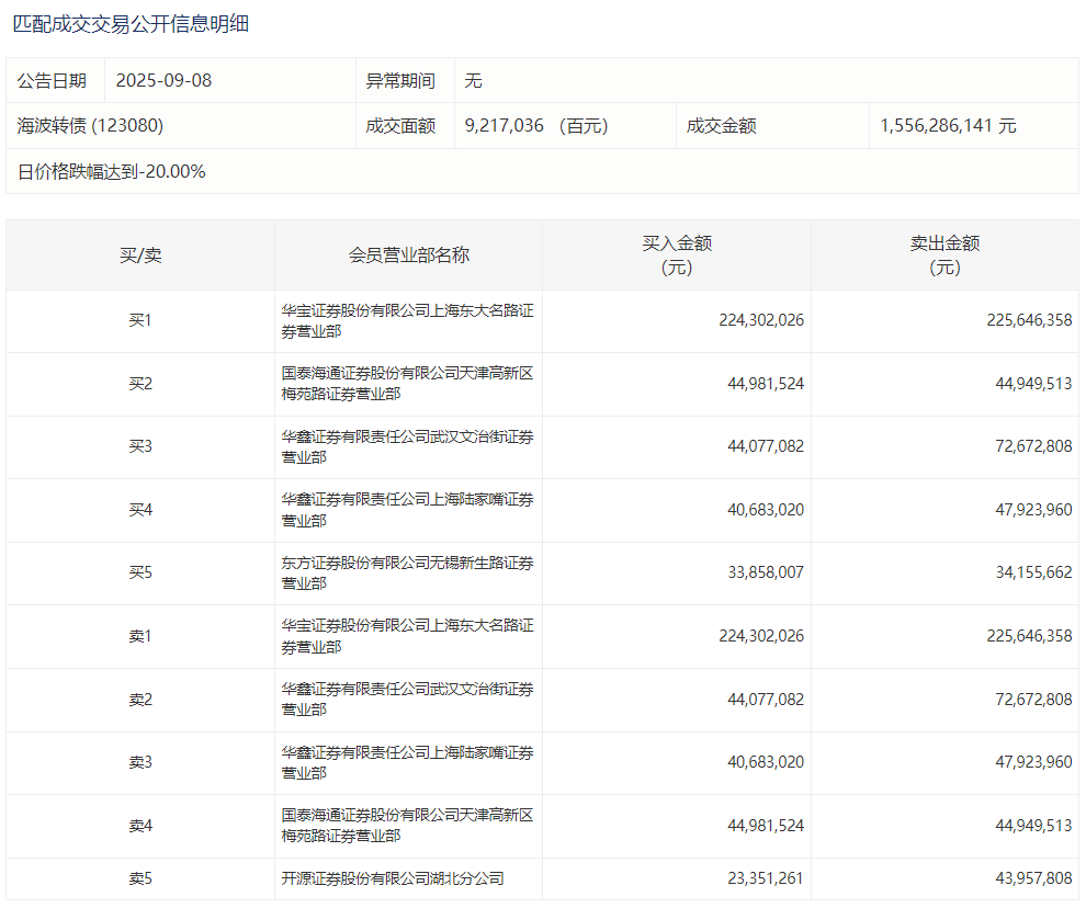 2025年9月8日,上交所可转债龙虎榜有1支转债,深交所可转债龙虎榜有2支转债。