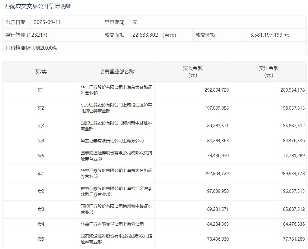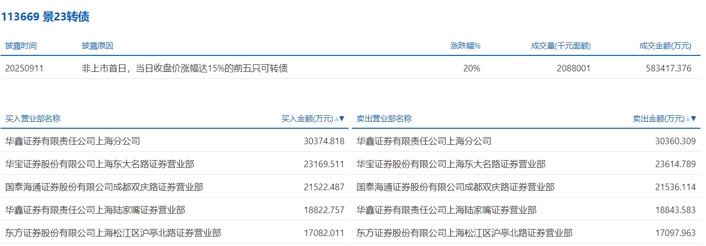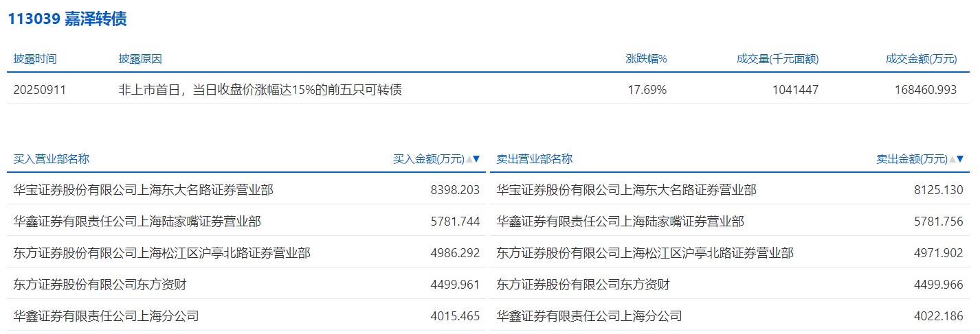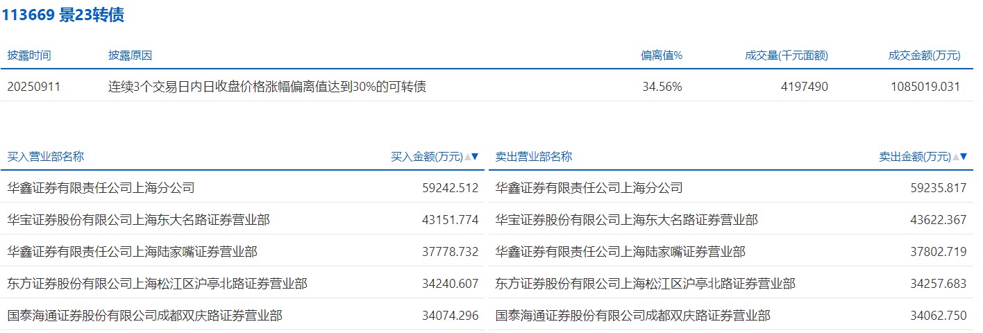 2025年9月11日,上交所可转债龙虎榜有2支转债,深交所可转债龙虎榜有1支转债。