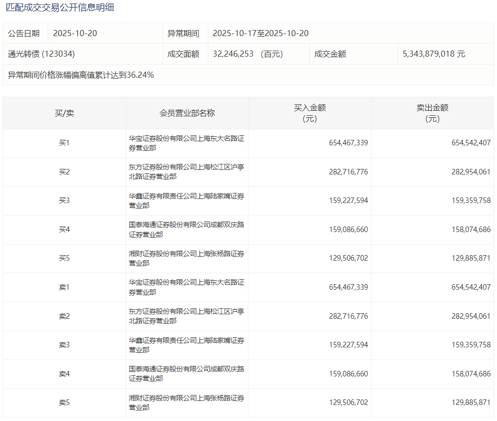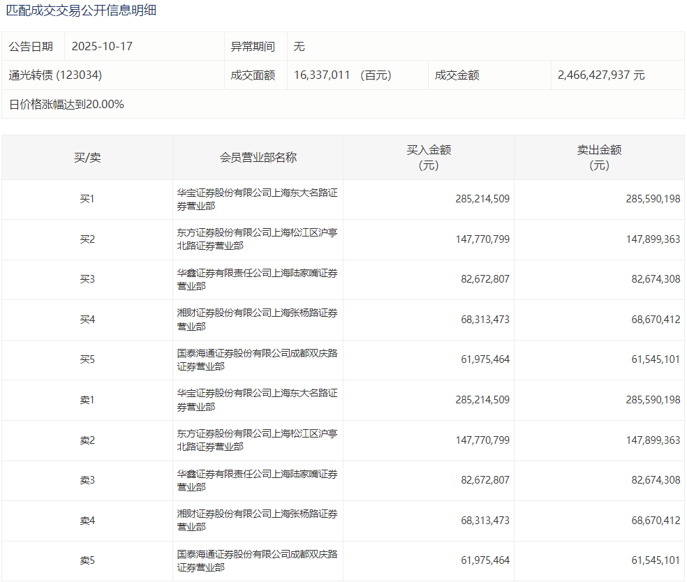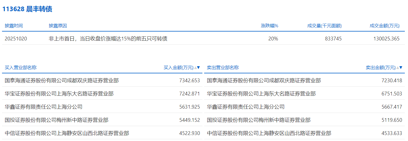 2025年10月20日,上交所可转债龙虎榜有1支转债,深交所可转债龙虎榜有1支转债。