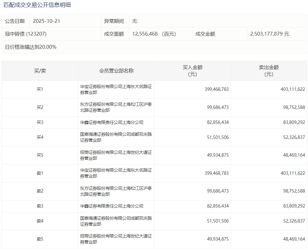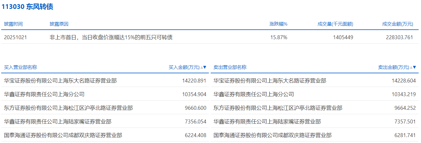 2025年10月21日,上交所可转债龙虎榜有1支转债,深交所可转债龙虎榜有1支转债。