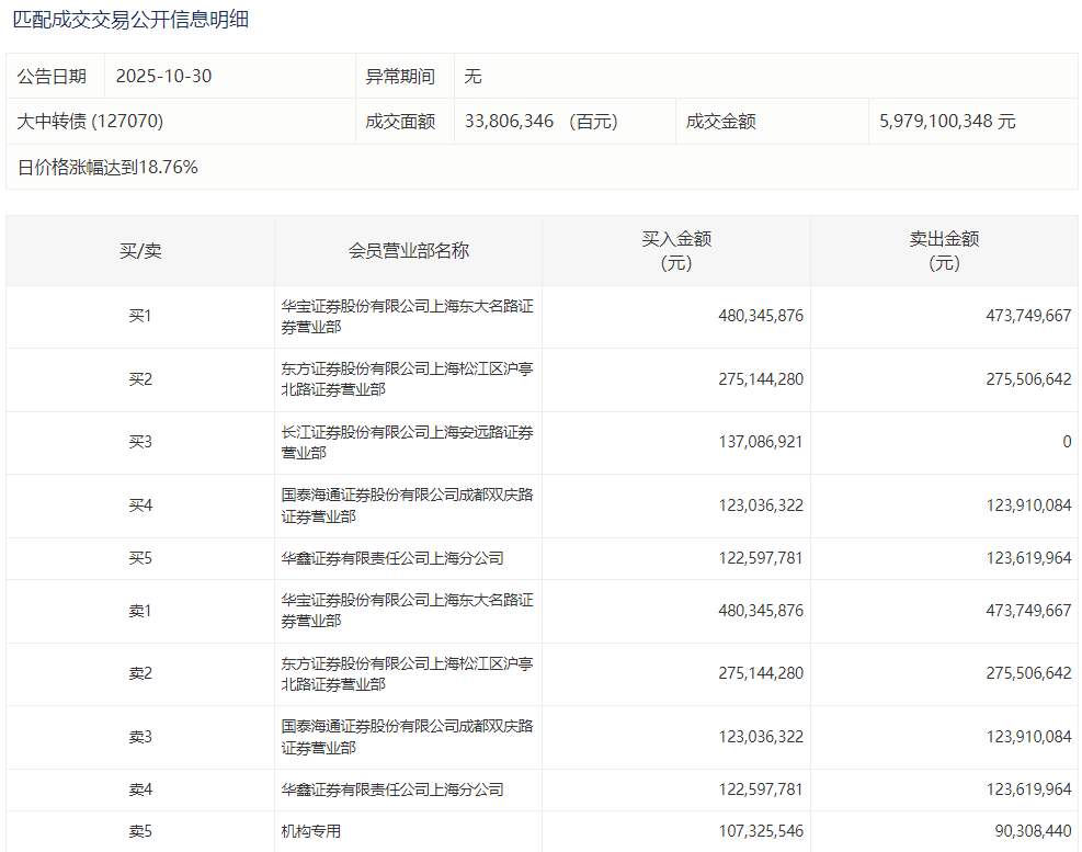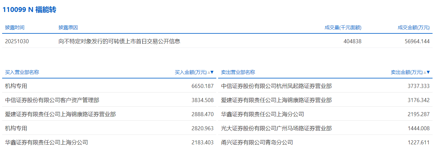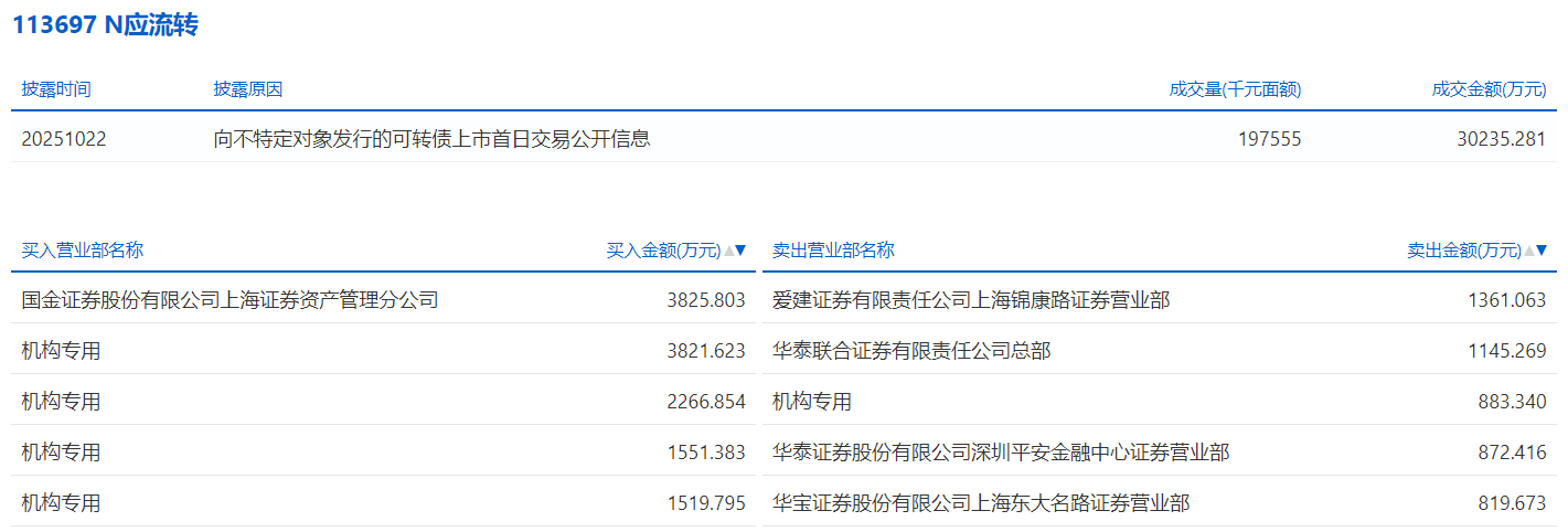 2025年10月30日,上交所可转债龙虎榜有1支转债,深交所可转债龙虎榜有1支转债。