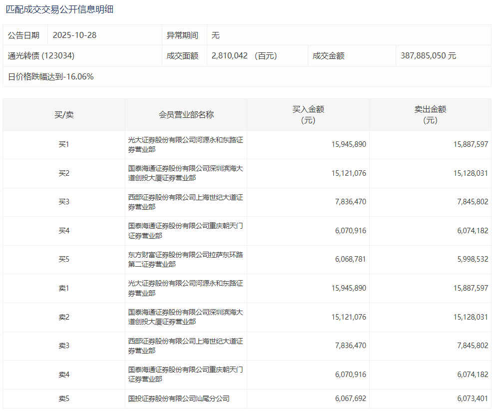 2025年10月28日,深交所可转债龙虎榜有1支转债。
